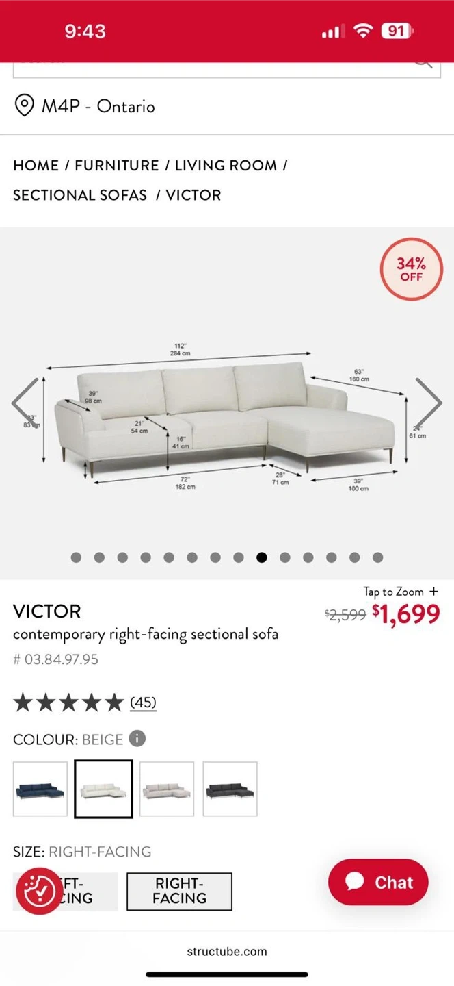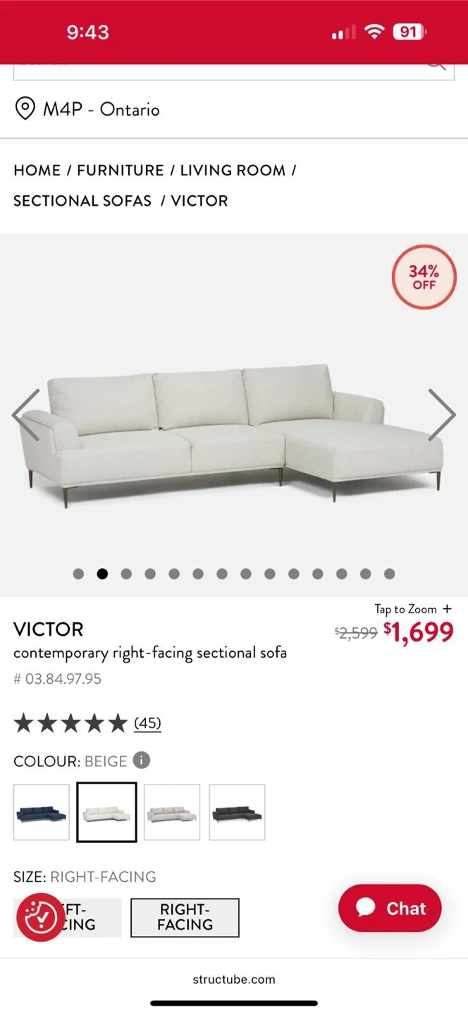 190Price: $1,100 (negotiable) Condition: Excellent β professionally cleaned, gently used for 18 months Original Price: bought at Structube for $1,699 on sale Pickup: Midtown Toronto (M4P area) β can help arrange delivery with an UberXL or local mover if needed Details: β’ Structube Victor model (right-facing) β’ Colour: Beige β’ Dimensions: 112β W Γ 83β D Γ 39β H (see photo for full measurements) β’ Smoke-free & pet-free living room (dog does not use the couch) β’ Cushions are firm and supportive, fabric in great shape β’ Modern, minimalist design that fits well in condos or living rooms Why selling: Moving abroad soon. Extras: Recently cleaned and ready for pickup. π¦ Flexible pickup β can assist coordinating with UberXL or local delivery driver for an extra fee.