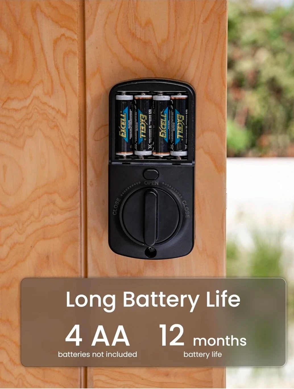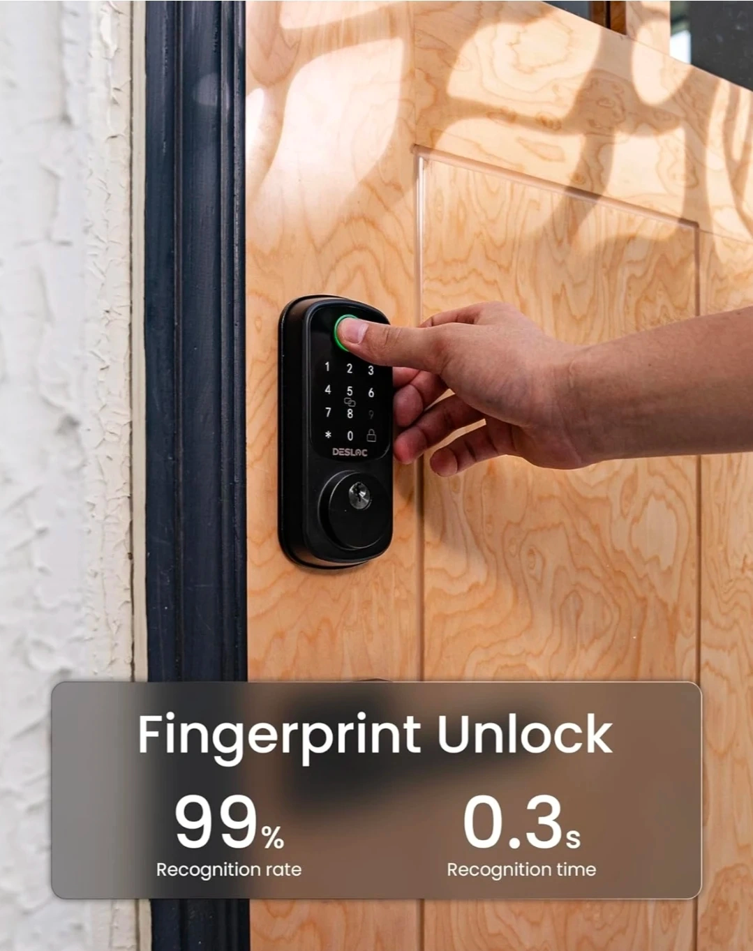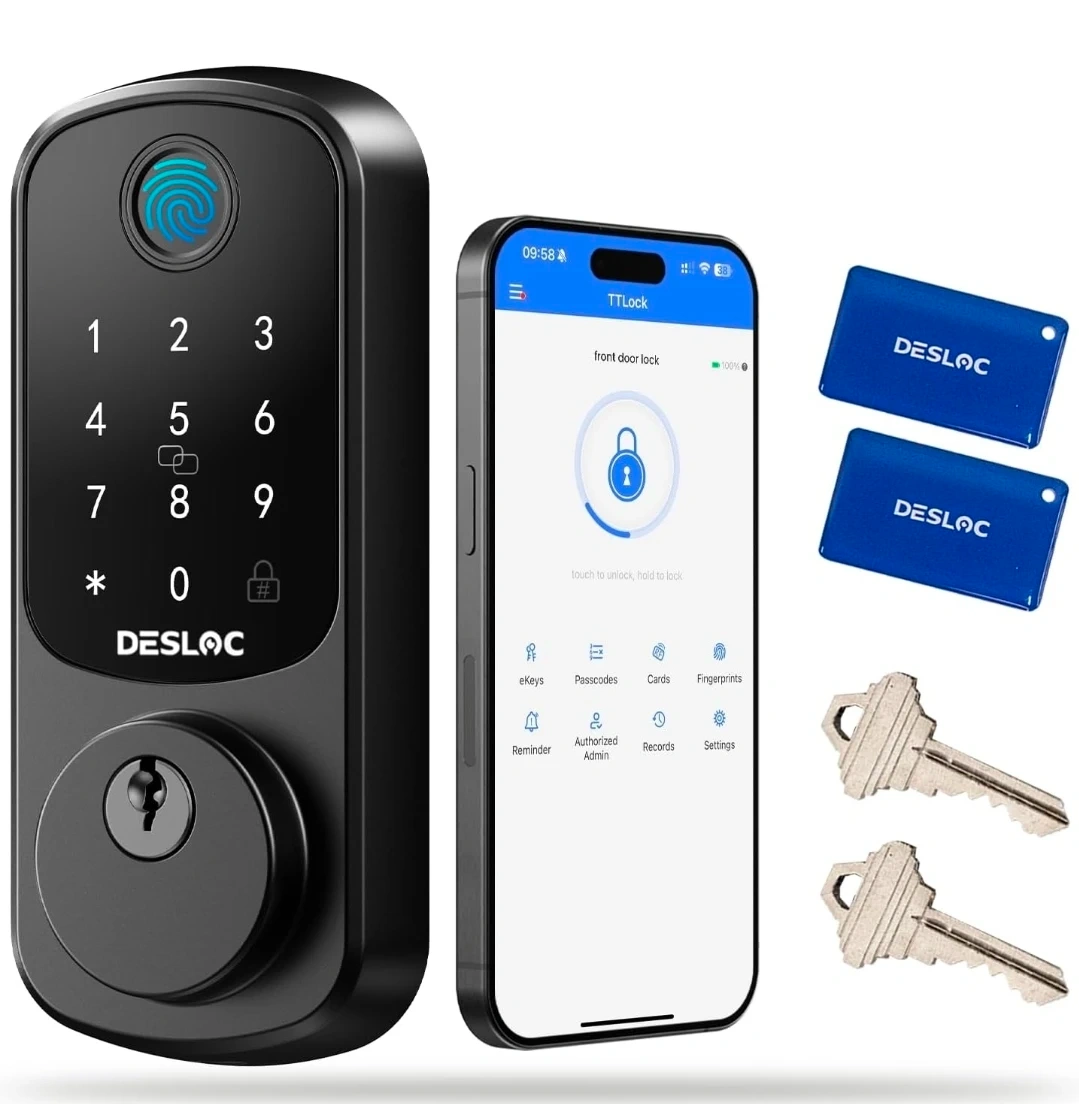 DESLOC smart lock for your front door. Unlock with 50 fingerprints, 150 PIN codes, 5 physical keys, ekey, or fobs. It's app-controlled via Bluetooth and offers 99% recognition rate with 0.3s recognition time. Powered by 4 AA batteries (not included), it boasts a 12-month battery life.