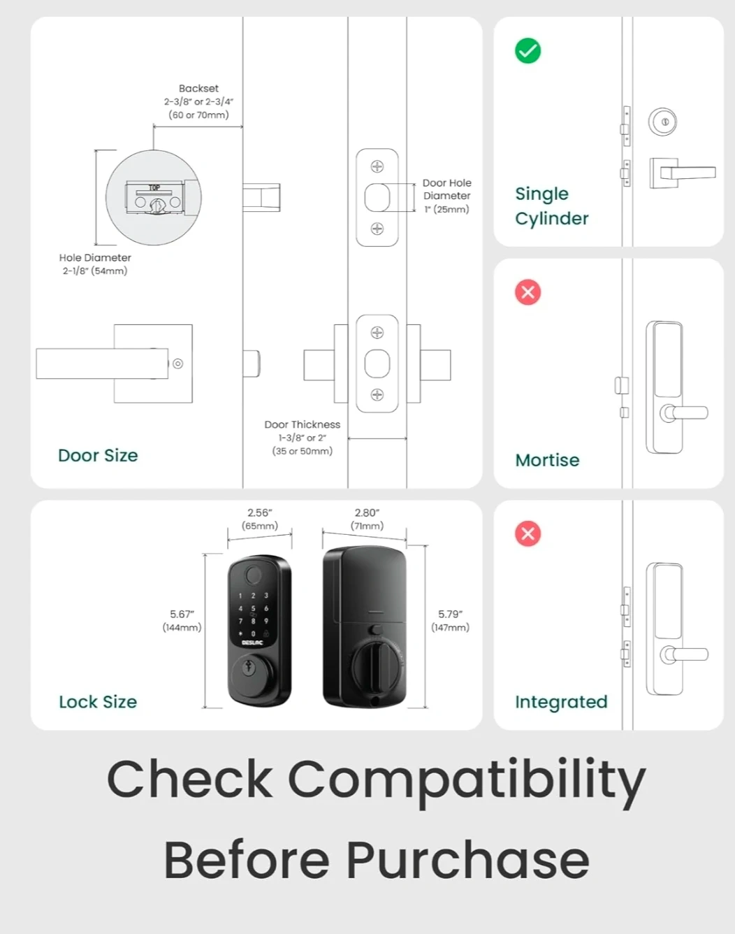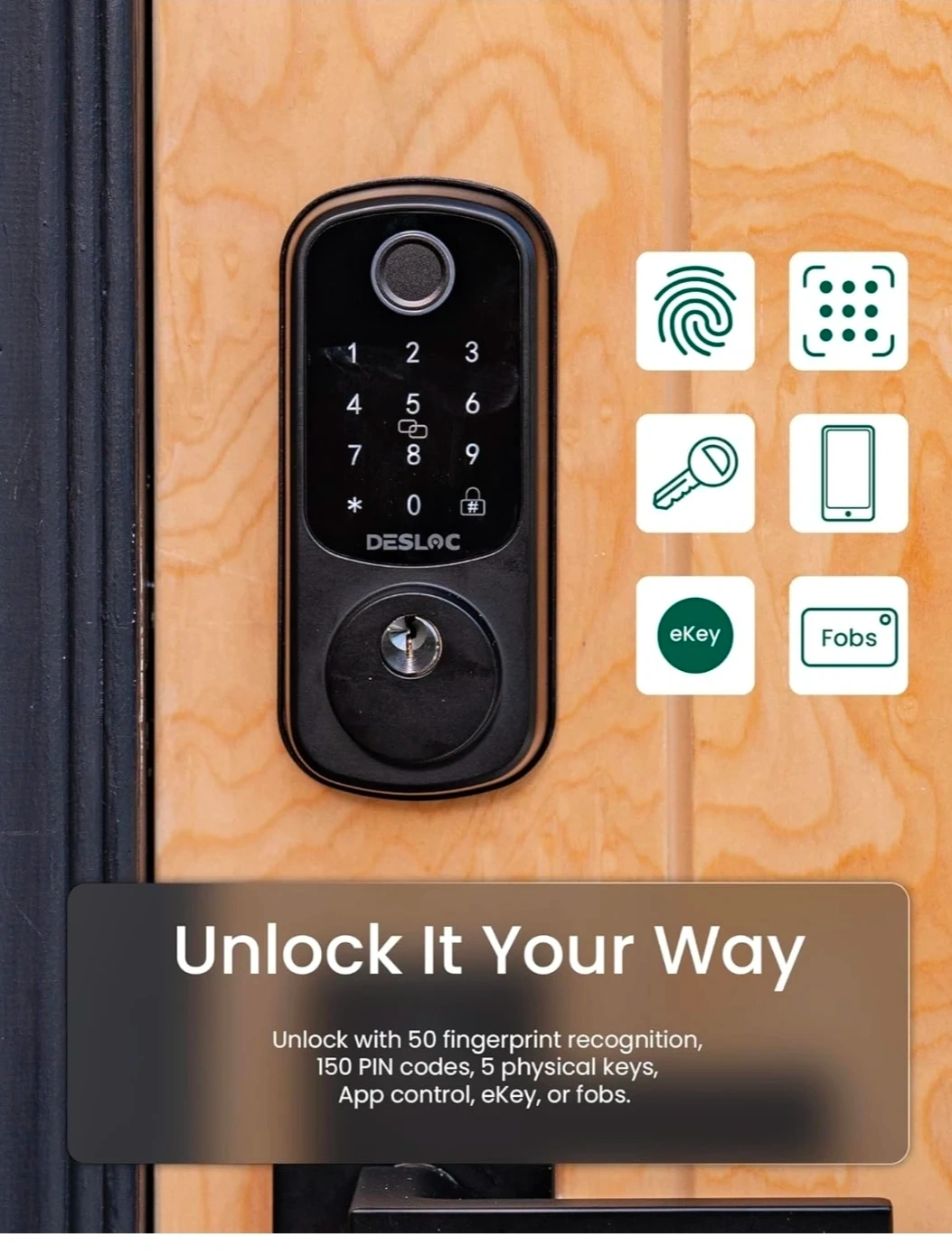 DESLOC smart lock for your front door. Unlock with 50 fingerprints, 150 PIN codes, 5 physical keys, ekey, or fobs. It's app-controlled via Bluetooth and offers 99% recognition rate with 0.3s recognition time. Powered by 4 AA batteries (not included), it boasts a 12-month battery life.