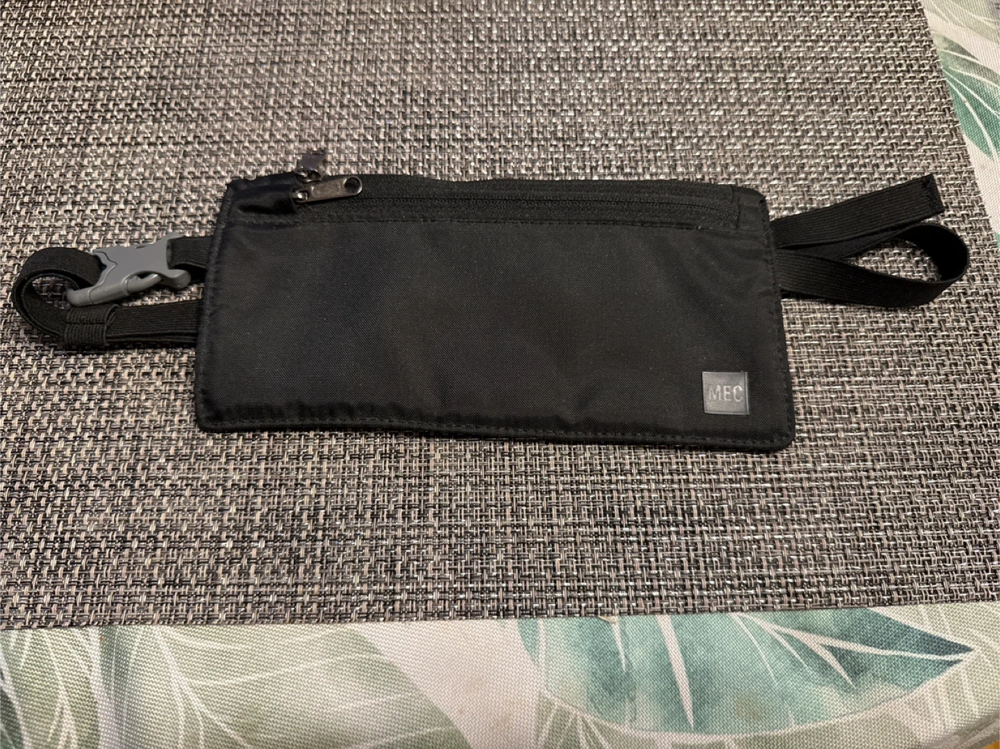 This MEC travel pouch is black and has a zippered main compartment and an adjustable elastic strap. It's made of durable fabric for carrying essentials on the go. Perfect for keeping your passport and money secure during trips!