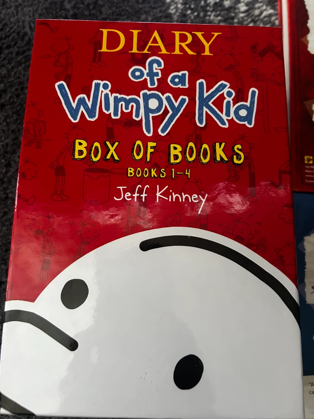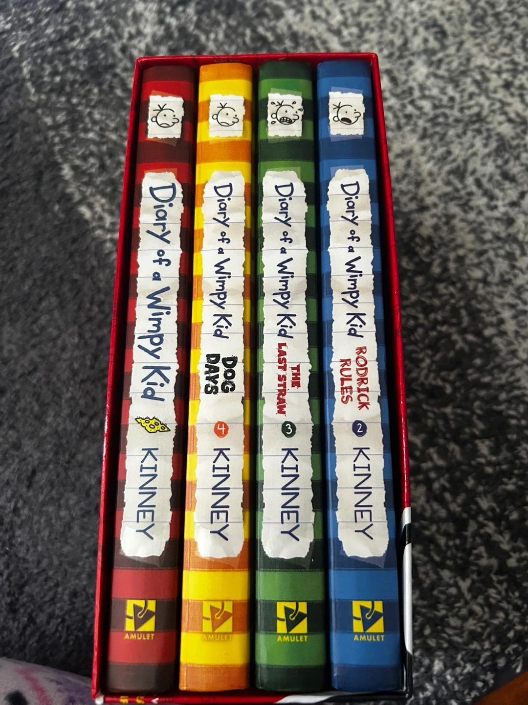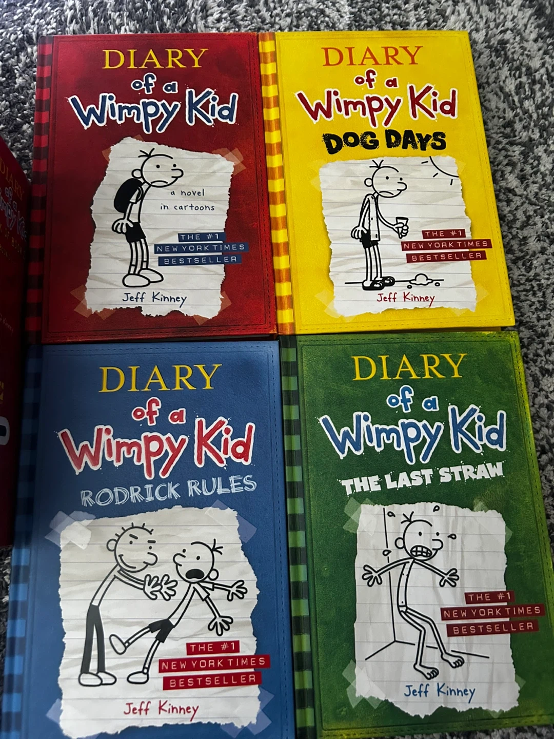 This set includes books 1-4 of the Diary of a Wimpy Kid series by Jeff Kinney. It contains 'Diary of a Wimpy Kid', 'Rodrick Rules', 'The Last Straw', and 'Dog Days'. These are popular novels for young readers.