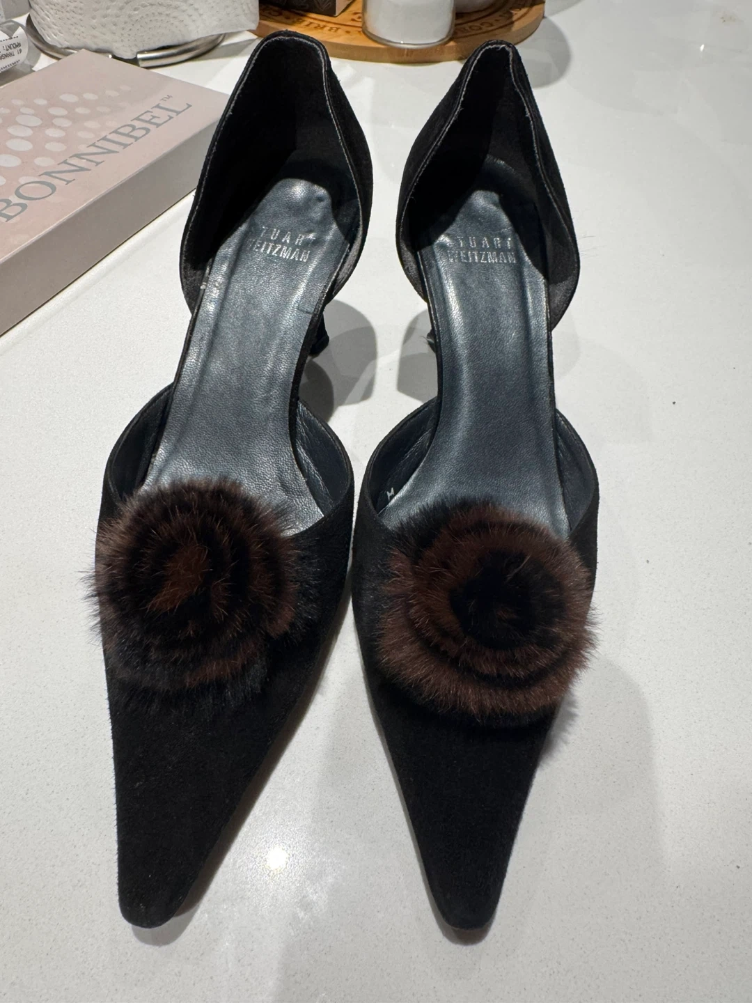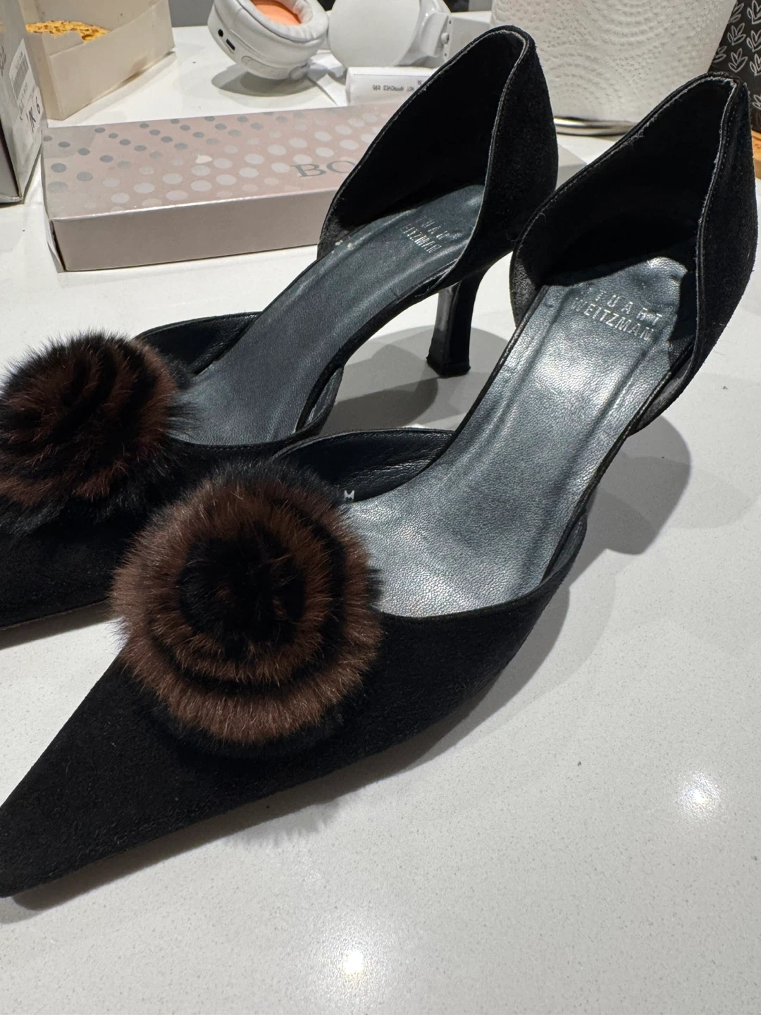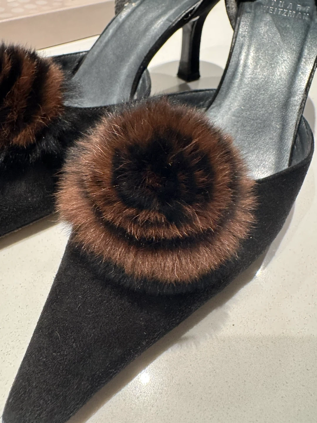 Selling a pair of Stuart Weitzman heels in black suede. They are a size 6M and feature a cute fur pompom detail. Perfect for adding a touch of elegance to any outfit!