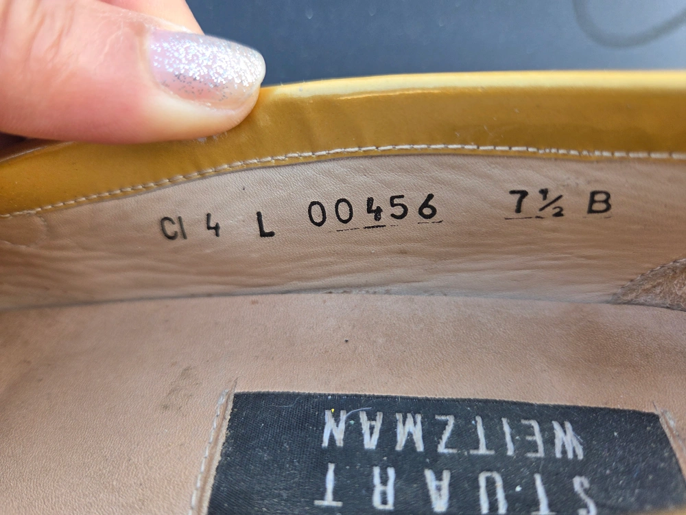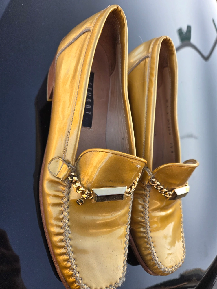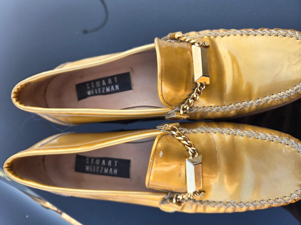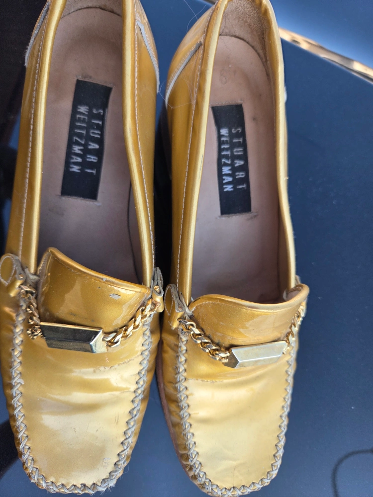 70These are a pair of Stuart Weitzman loafers in a size 7.5. They have a unique design with gold chain detailing. They are in used condition.