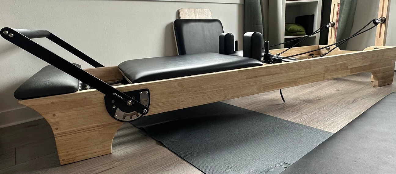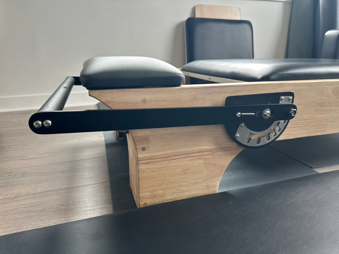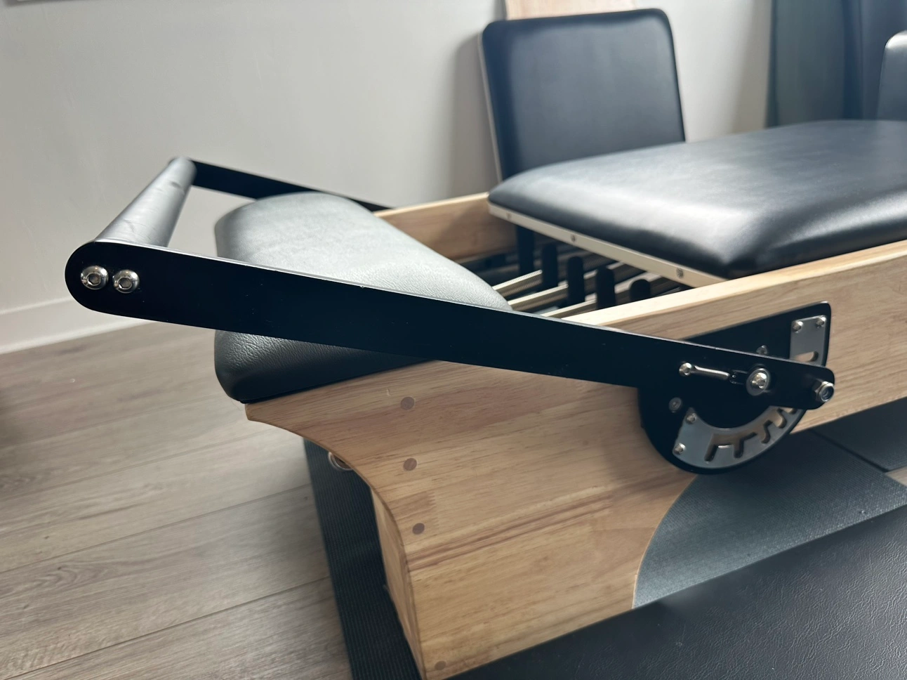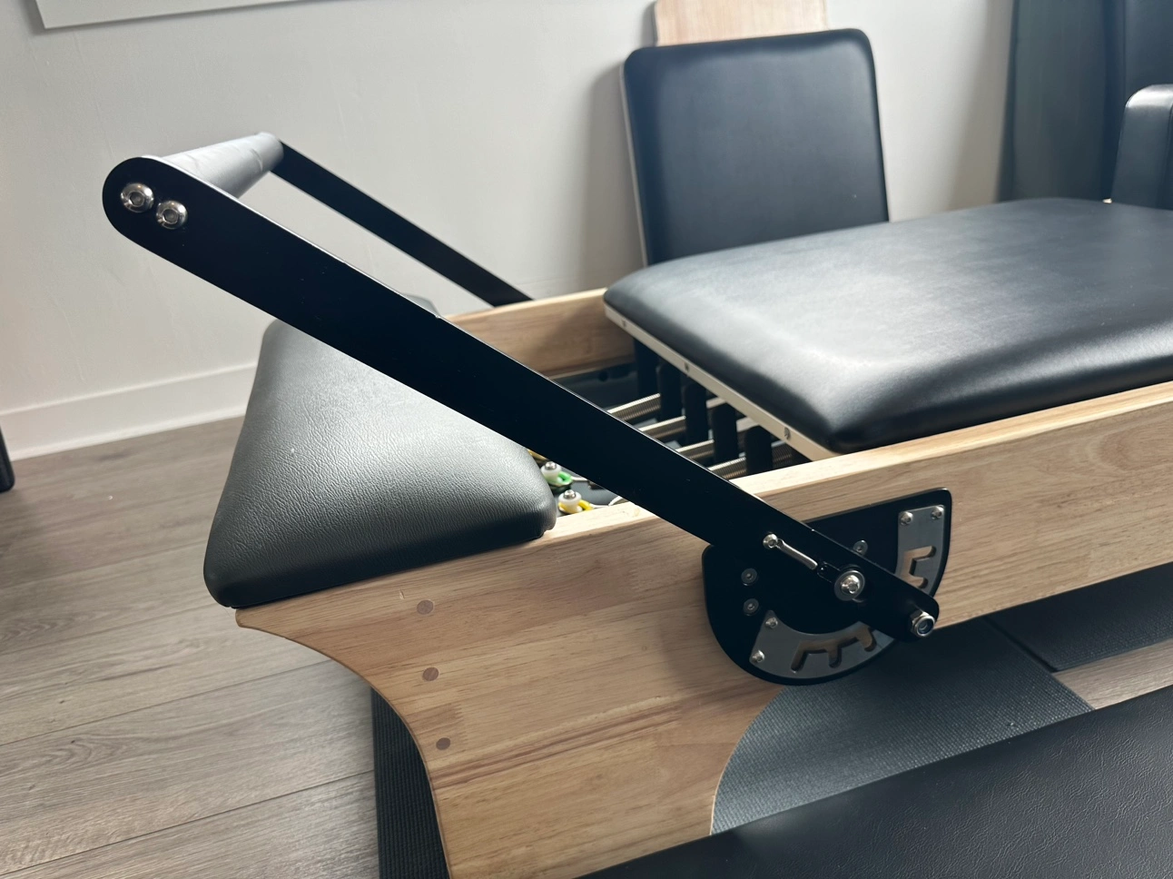 10Studio Reformer from China that has been upgraded for studio use: 5 spring system, new wheels and loops. The carriage is best for therapeutics as the cushioning is tempurpedic as well as the Jumpboard offers cushioning. Excellent for a Clinic or an individual working through rehab of a soft tissue injury