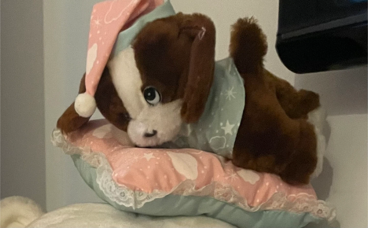 85A cute, cuddly stuffed dog toy is looking for a new home! This plush pal comes with its own little pillow and nightcap, ready for bedtime stories and sweet dreams. It's in great condition and would make a lovely addition to any child's toy collection or as a charming decorative piece