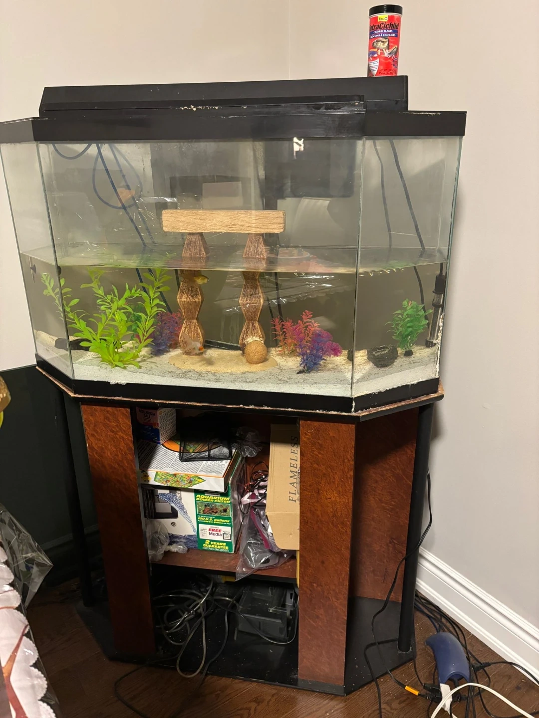 192This is a used hexagonal aquarium complete with stand. It's perfect for creating a captivating underwater world right in your home. The aquarium comes equipped with everything you need to get started. * Hexagonal design * Matching stand included * Filter and heater 45 gallon comes with aqua clear 50 filter comes with heater, hood, light and decor inside