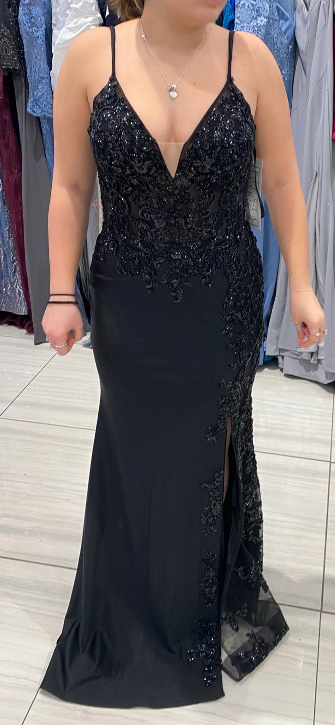 20Gorgeous black floor-length gown. Features a V-neckline, sequin embellishments, and a thigh-high slit. Elegant and flattering silhouette. Perfect for prom, special occasion, or wedding. Brand new never worn. My daughter changed her mind for her prom dress and store doesn’t return of refund. Got it at classic boutique in Richmond hill price was $450 plus tax I’ll let it go for $150 cash