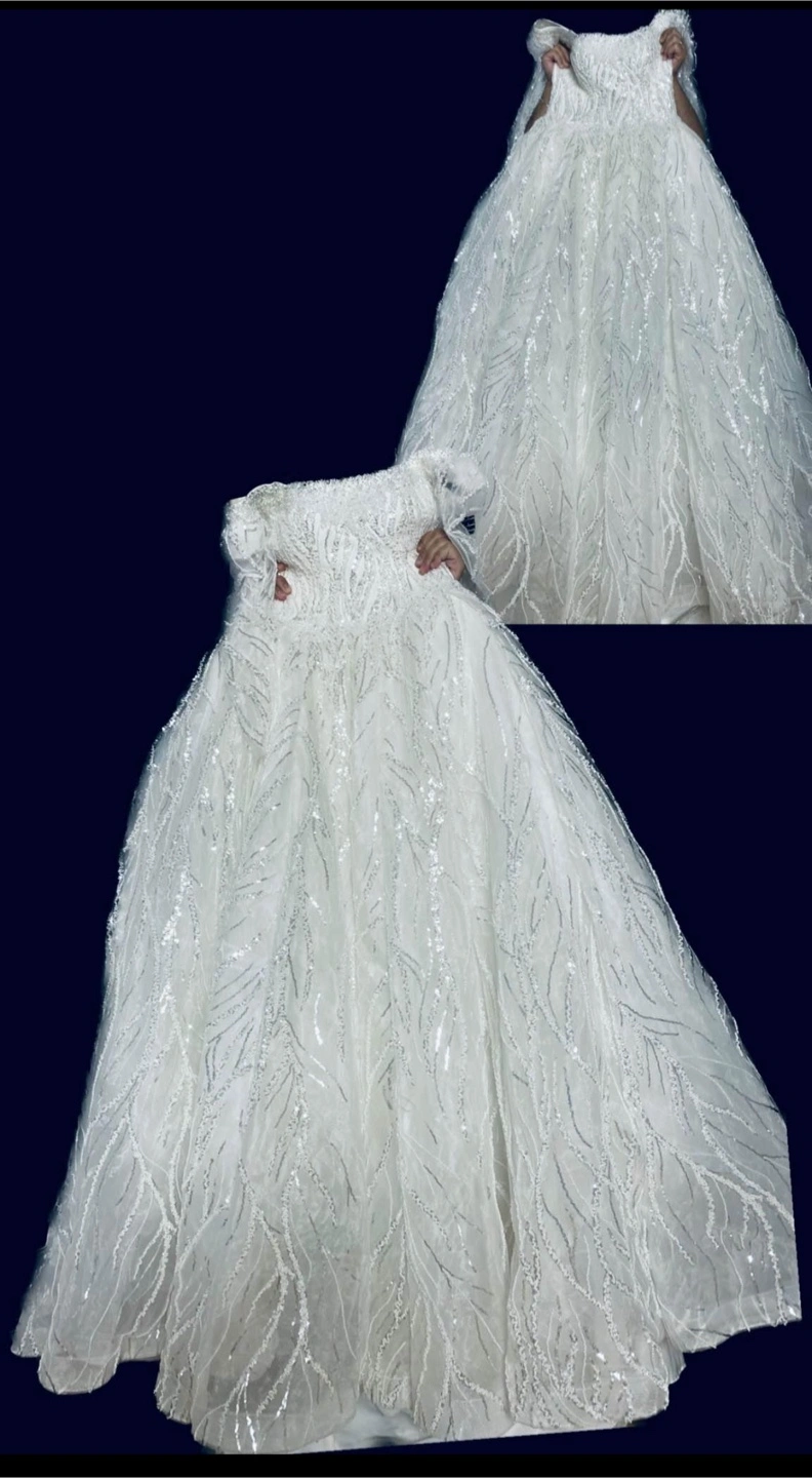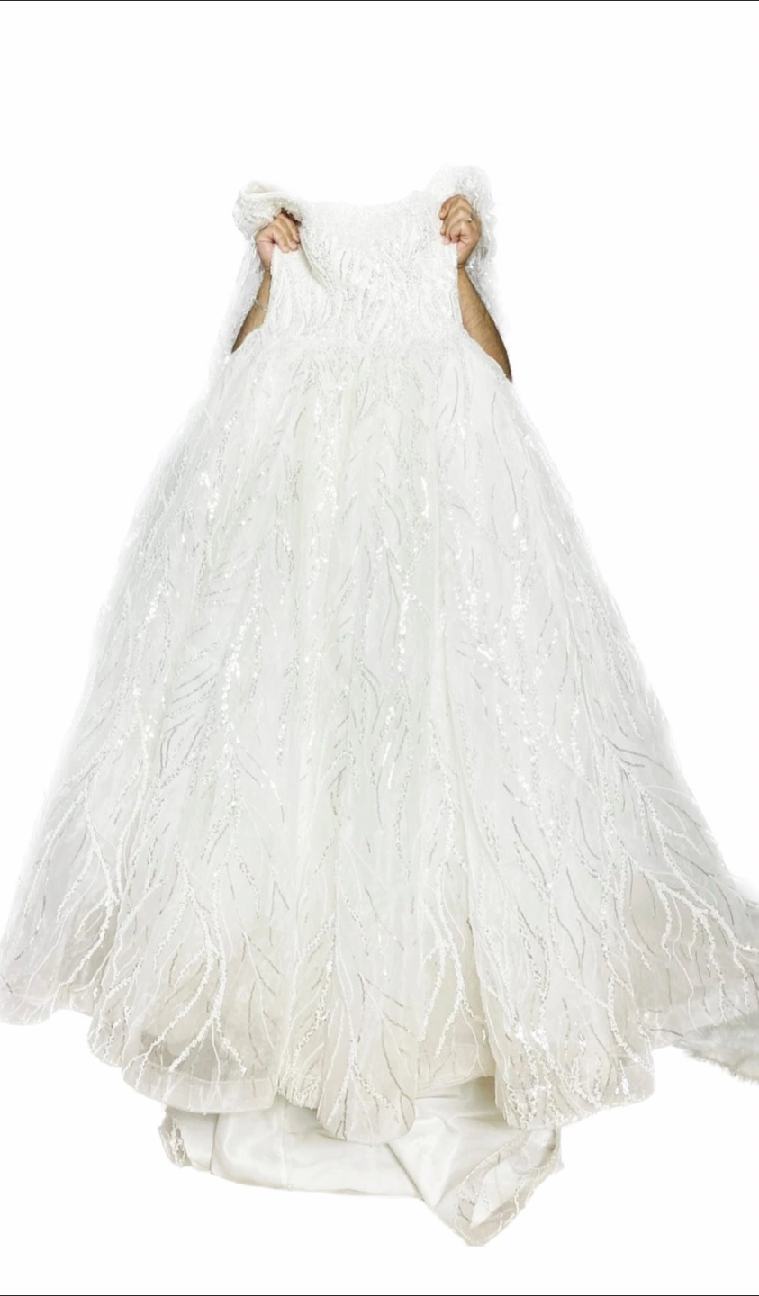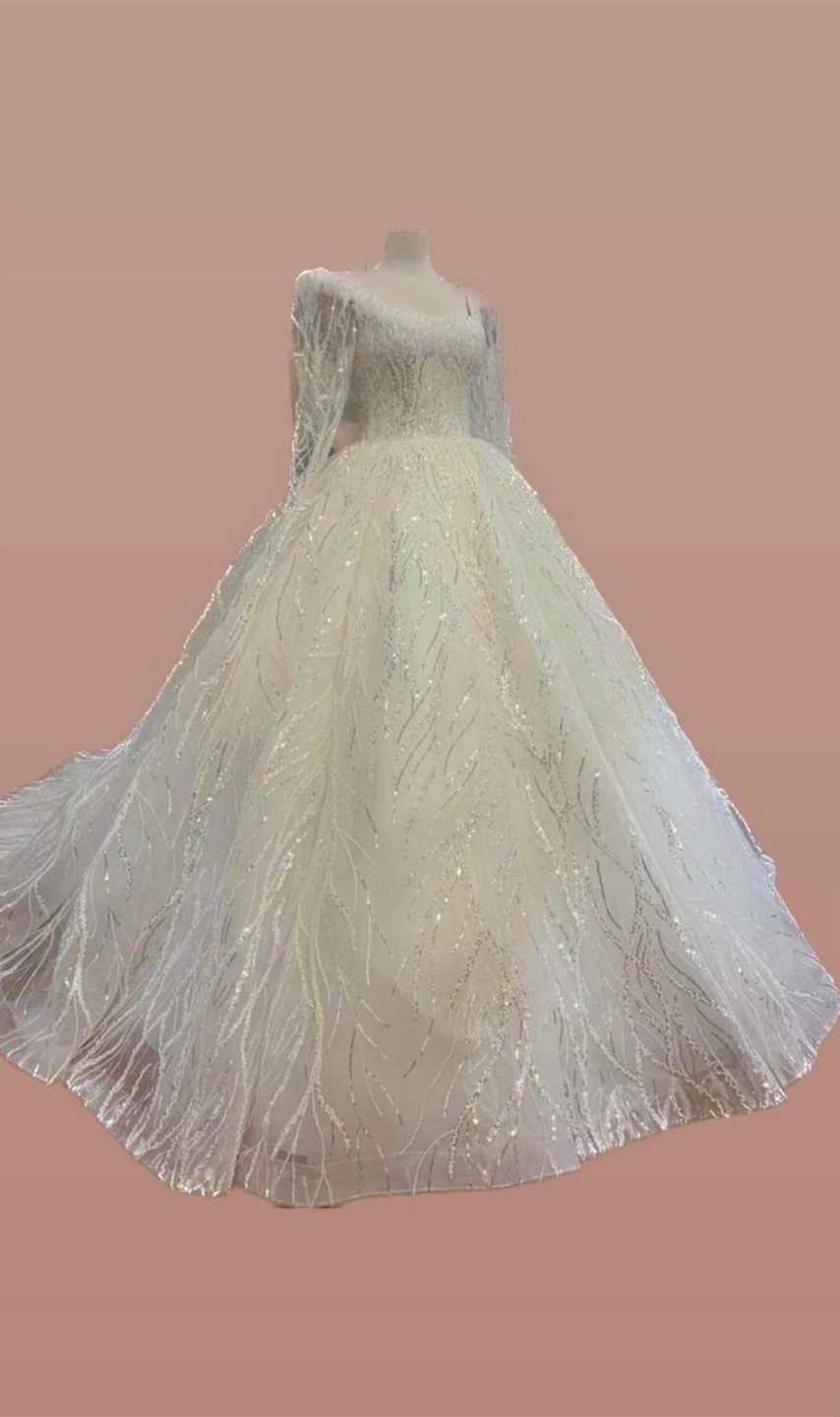 Gorgeous white wedding dress. Long sleeves. Embellished bodice and skirt. Floor-length. Ballgown style. Beautiful details.