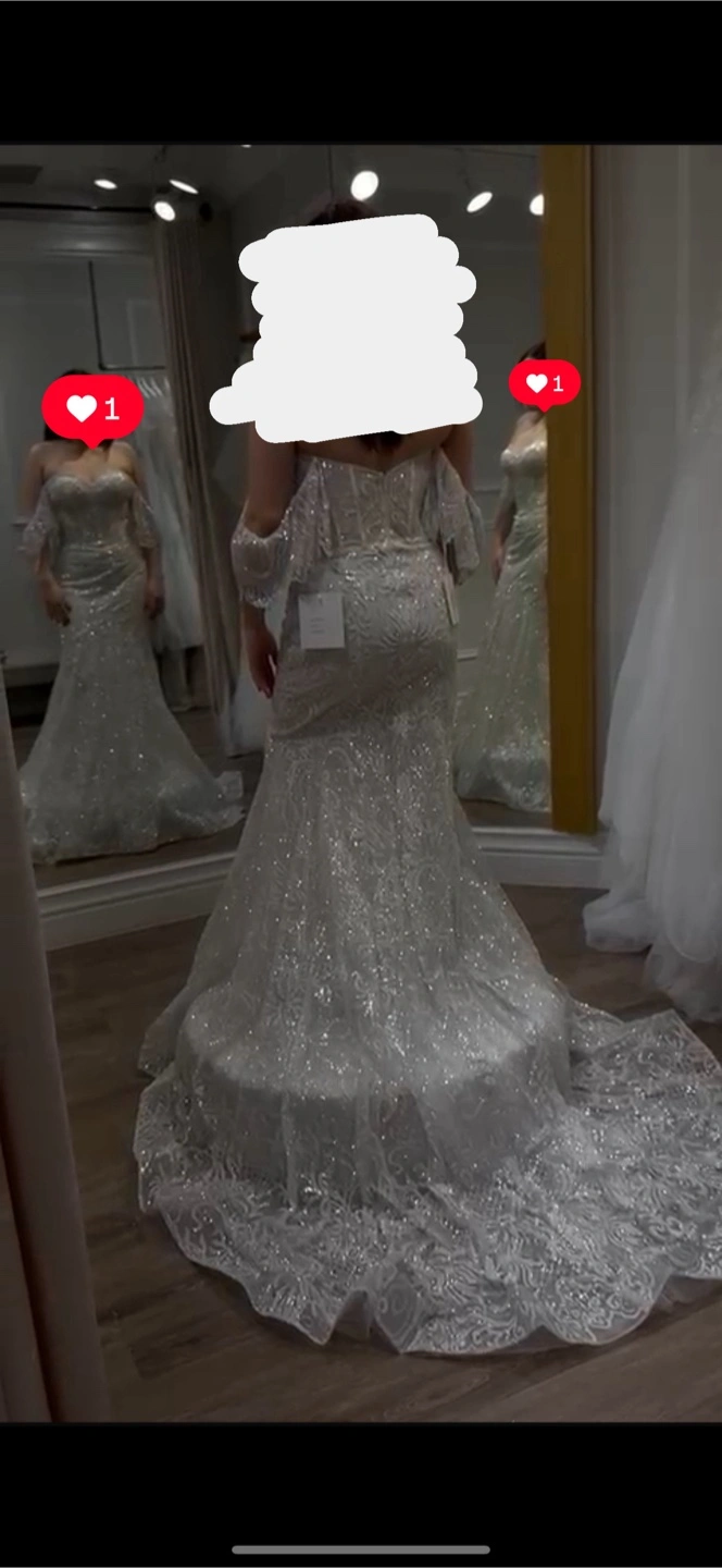 Gorgeous sparkly wedding dress. Off-the-shoulder sleeves. Fitted bodice and a flowing skirt. Excellent condition.