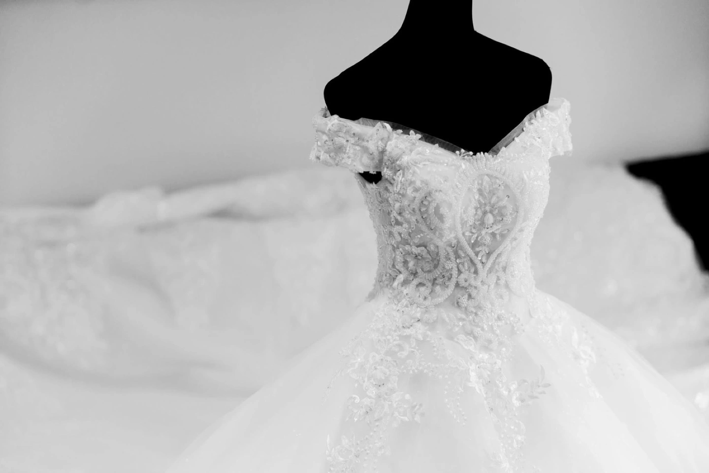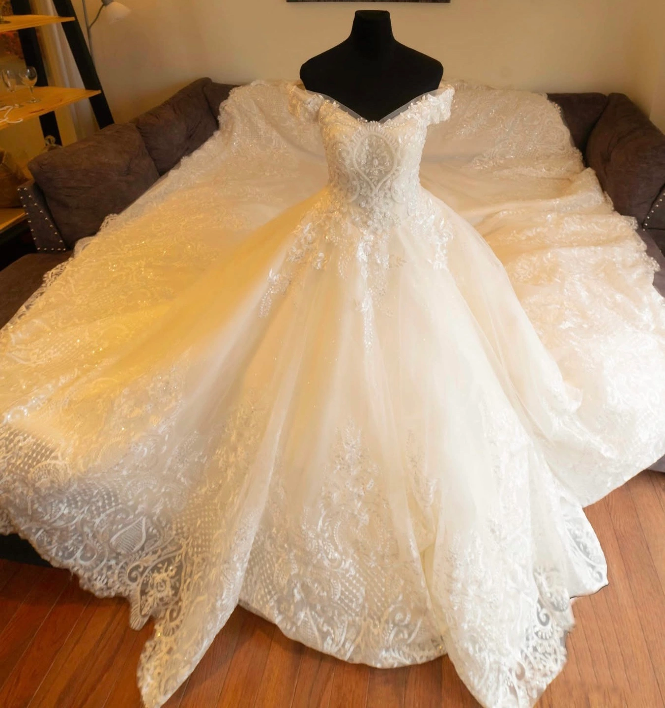 Gorgeous ballgown wedding dress. Off-the-shoulder neckline. Lace detailing throughout. Corset back. Long train. Perfect for a special occasion.
