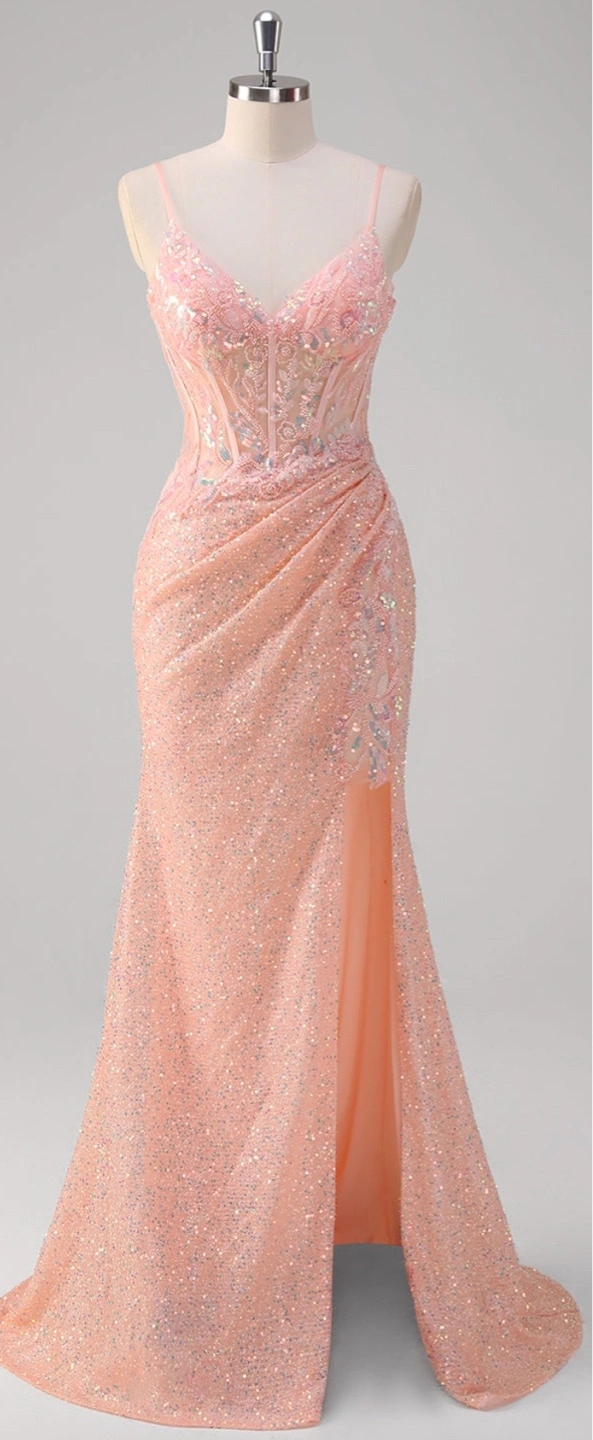 Gorgeous peach sparkly sequin prom dress. Features a fitted bodice, a flattering mermaid silhouette, and a thigh-high slit. Perfect for prom, a special occasion, or a glamorous event. Elegant and eye-catching. fits size 6-8 very adjustable for various sizes