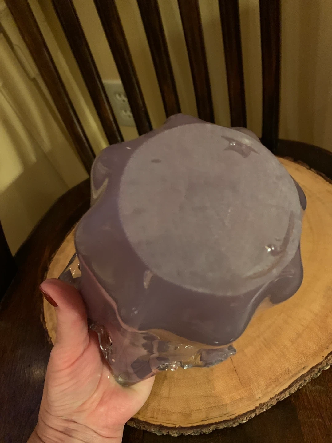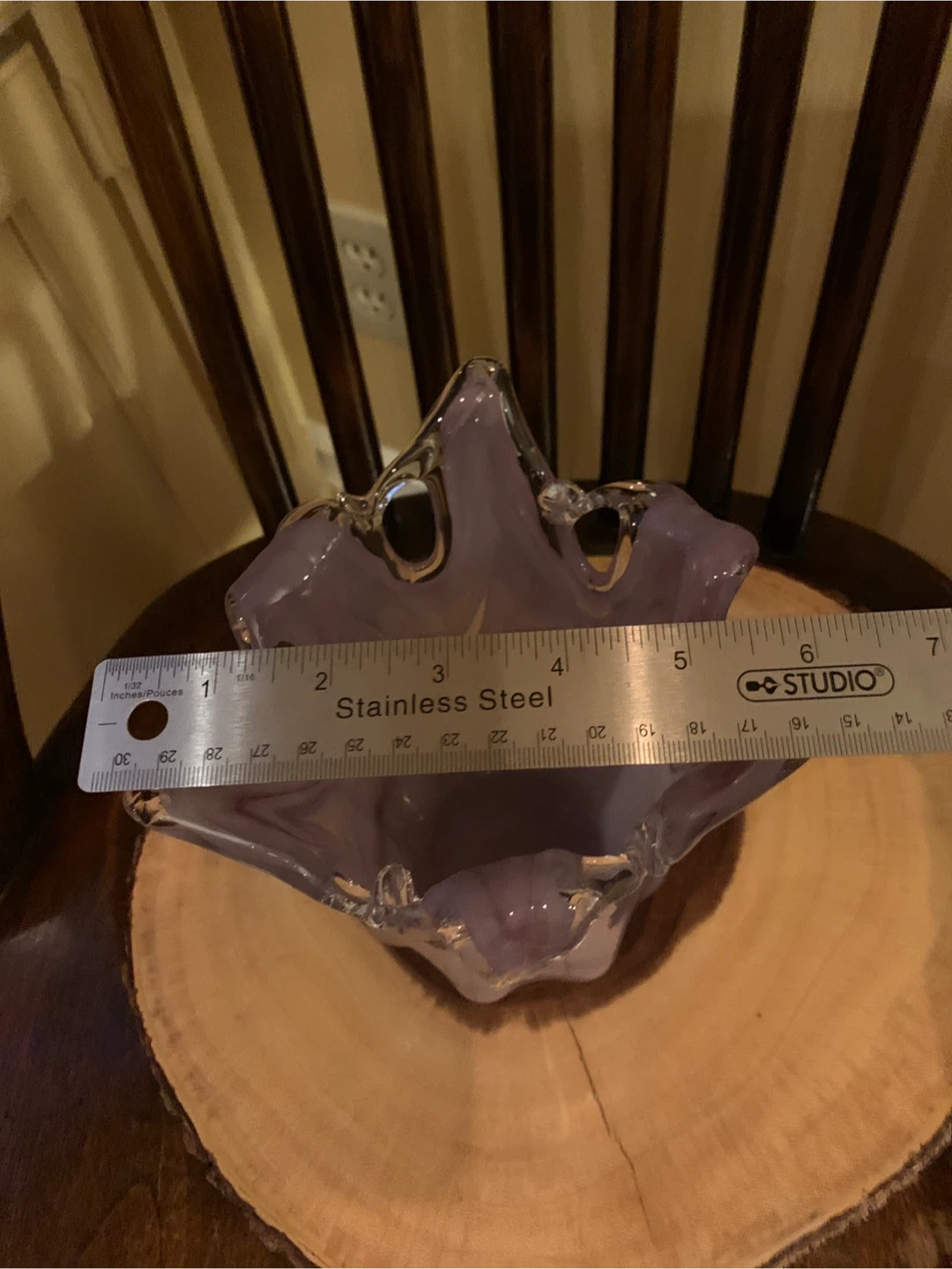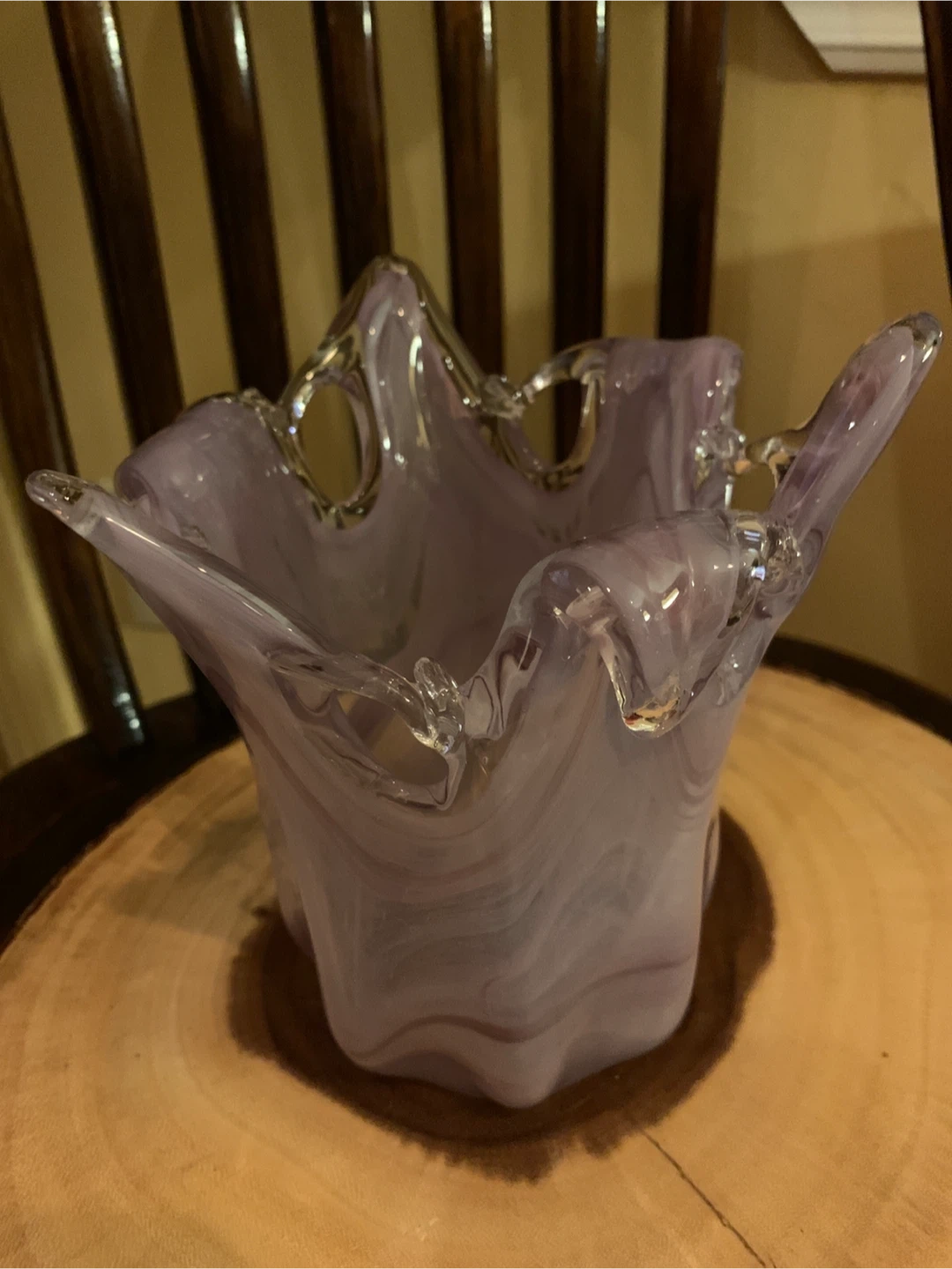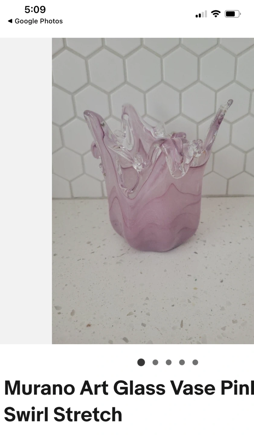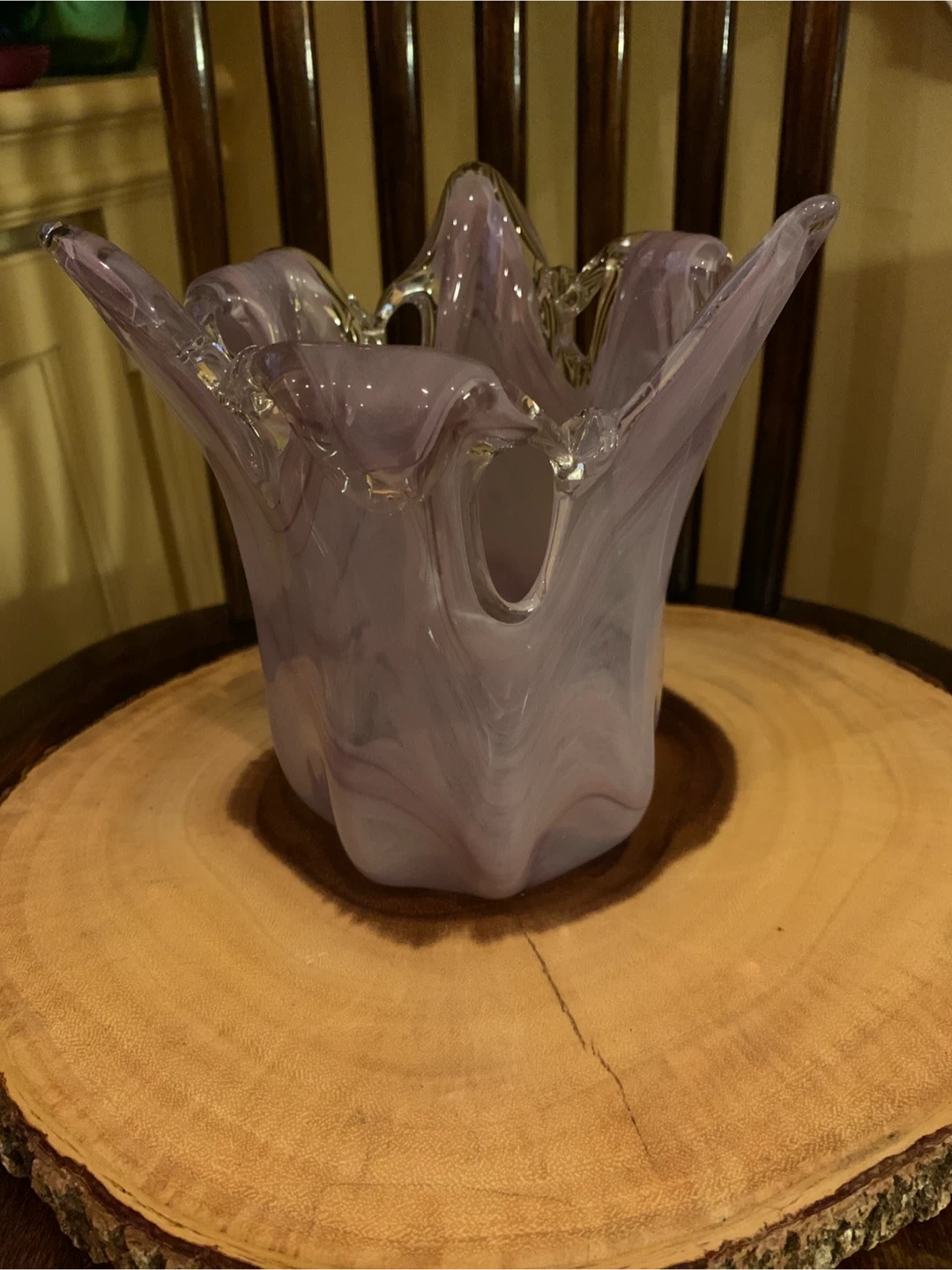 697Selling a stunning purple white swirl stretch glass decorative vase! My research shows that it is made in Italy by the famous Murano glass company. It has a pontil hand blown mark on the bottom. It's in great shape with no cracks or chips. It would look beautiful as a centerpiece or accent piece in any room, especially on a table or bookshelf. A very unique piece of art glass!💜 Cash only please. Props not included. Last picture is from the web showing a pink swirl stretch one.