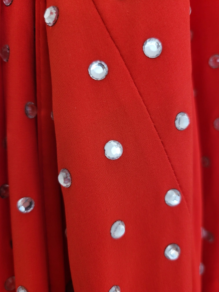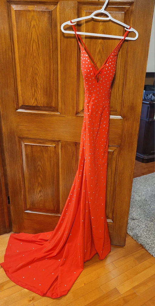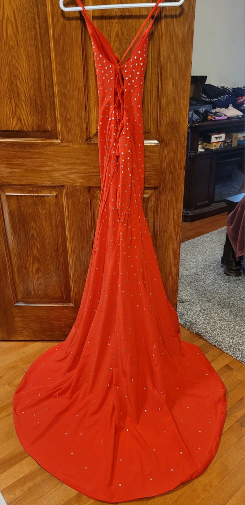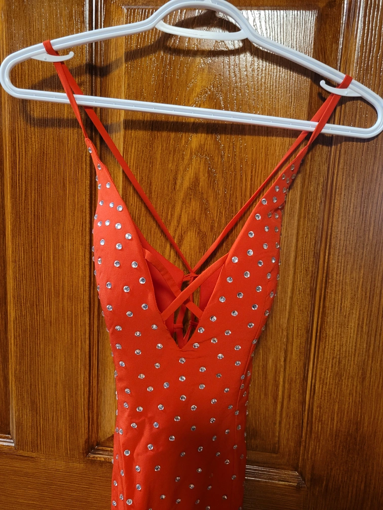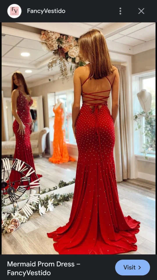 Elegant red mermaid prom dress. Features a deep V-neck, criss-cross back, and is adorned with sparkling rhinestones. Floor-length, form-fitting silhouette. Perfect for prom or special occasion.