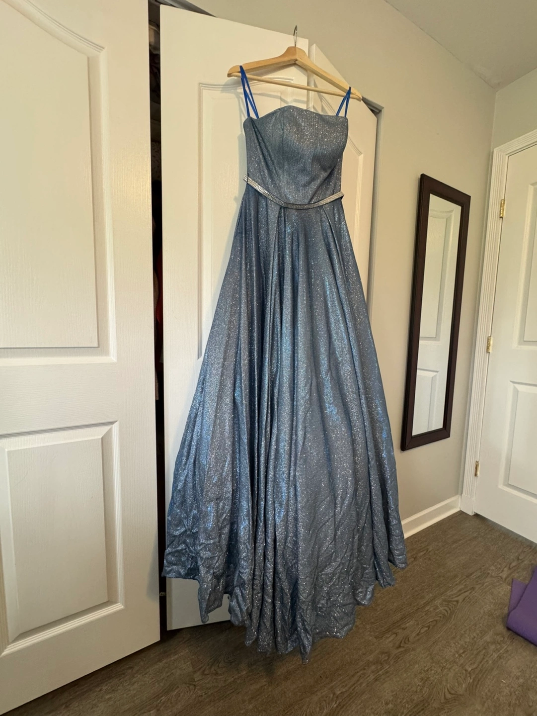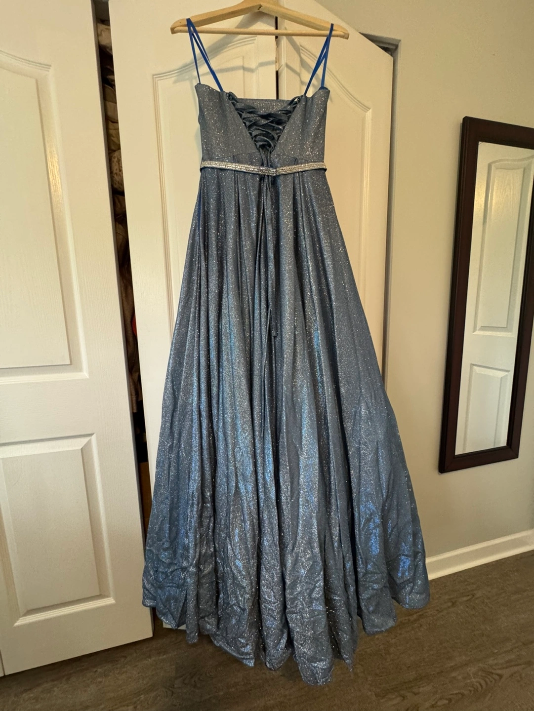 58Gorgeous sparkly blue prom dress. Features a sweetheart neckline, a fitted bodice, and a full, flowing skirt. Includes a sparkly belt. Beautiful for prom, a wedding, or any special occasion. Backlace closure. Used once only. Like new