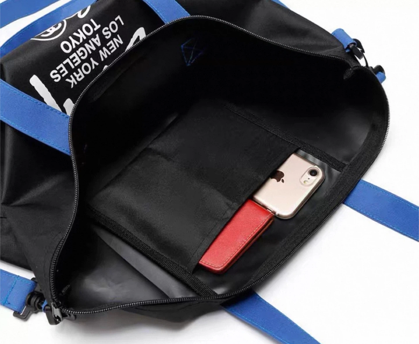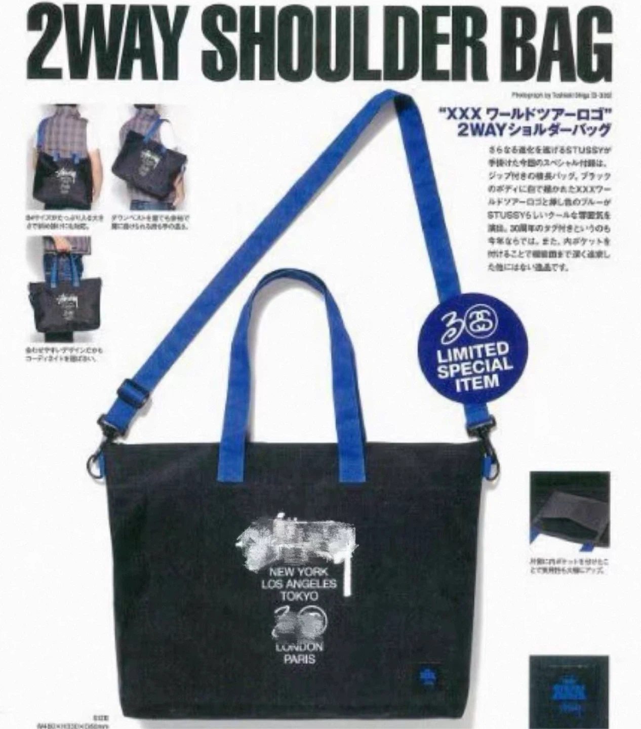 74Stussy 2 Way Shoulder Bag. It's black with blue straps and features the iconic Stussy logo. It's a limited special item, perfect for carrying your essentials in style! 2 colors: black / black & blue