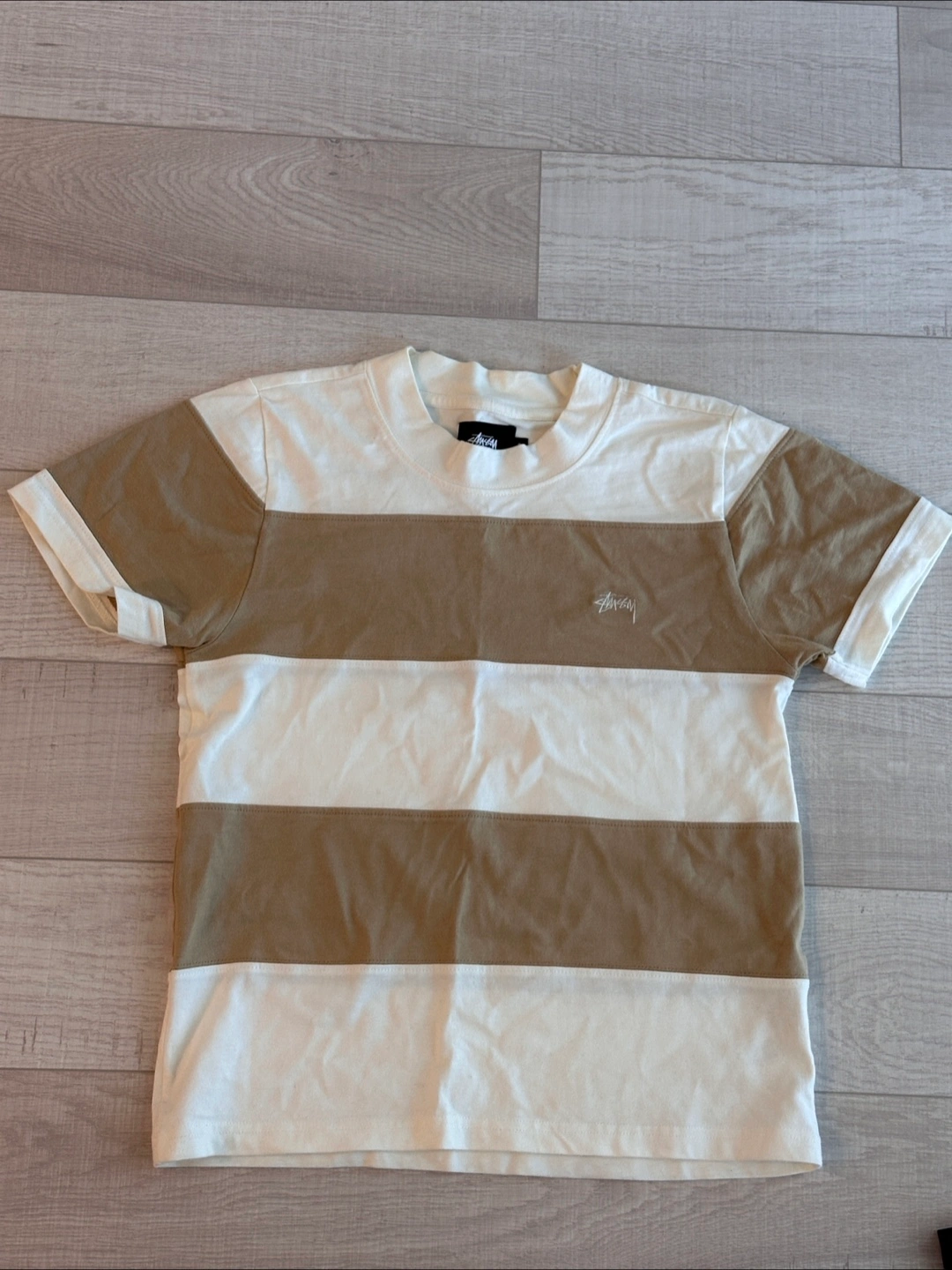 Selling a Stussy striped t-shirt in beige and white. It’s in great condition and ready for a new home!