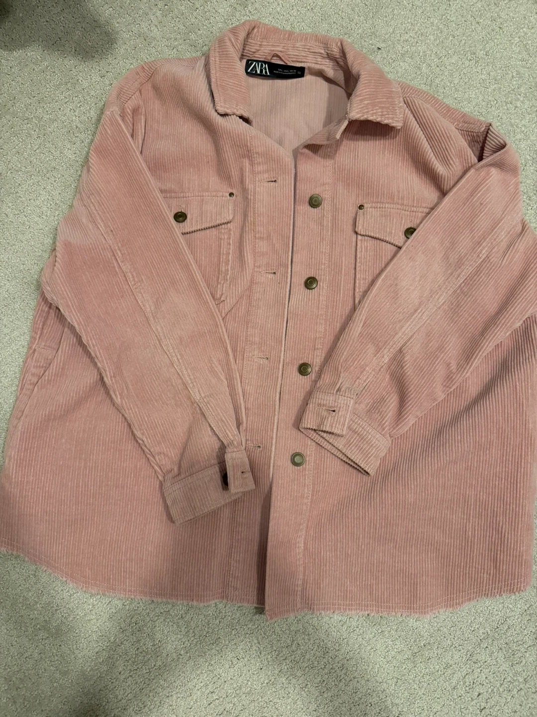 It's a ZARA pink corduroy shirt jacket with two chest pockets. Made from soft corduroy material. This oversized jacket is great for layering in cooler weather!
