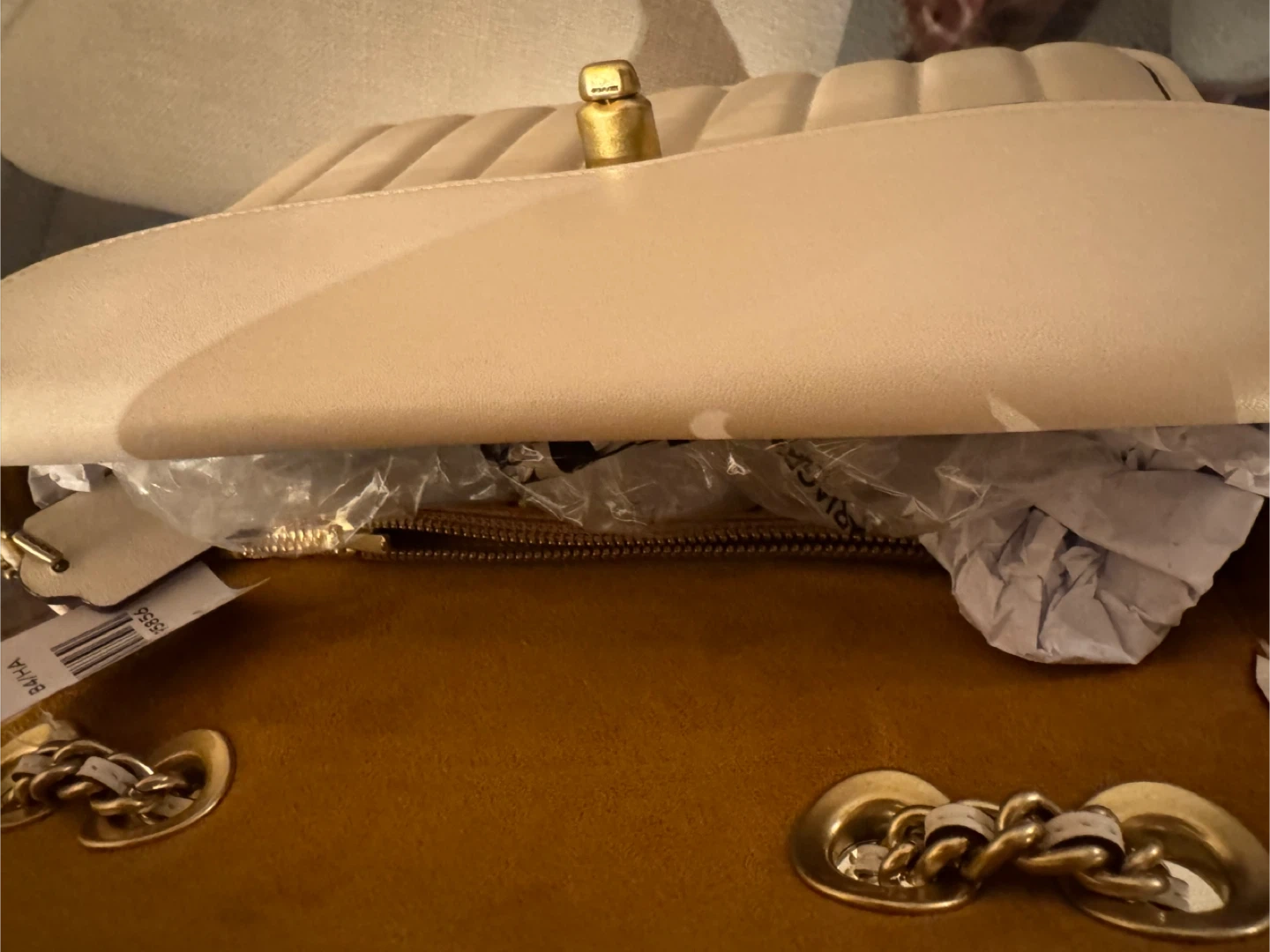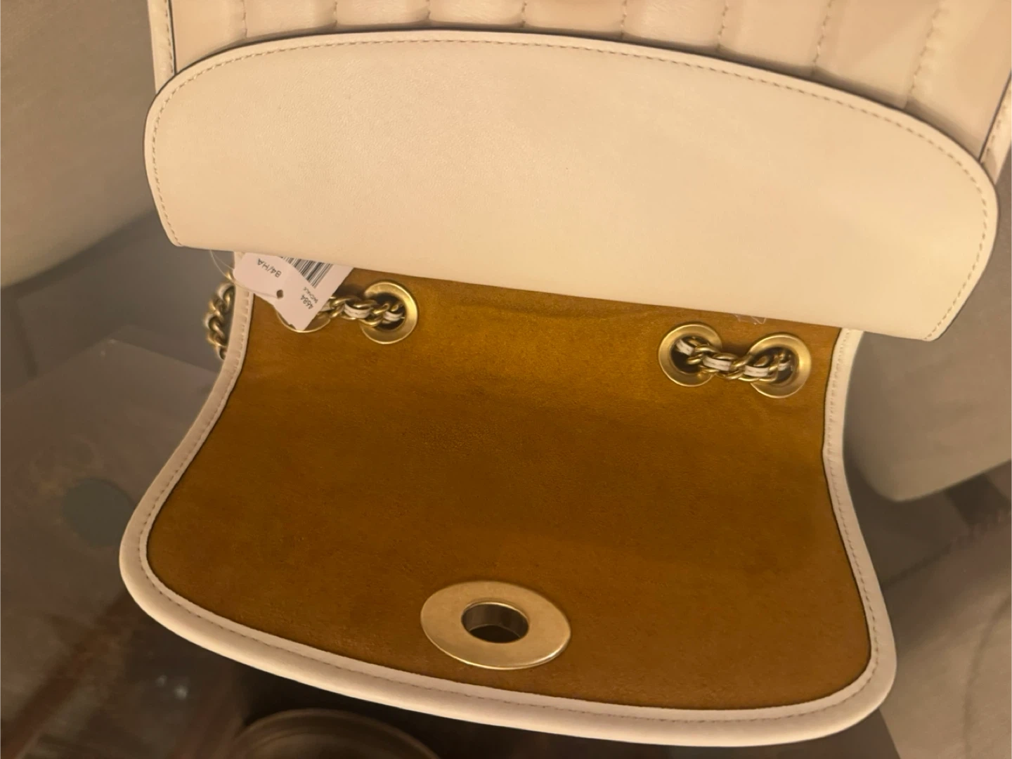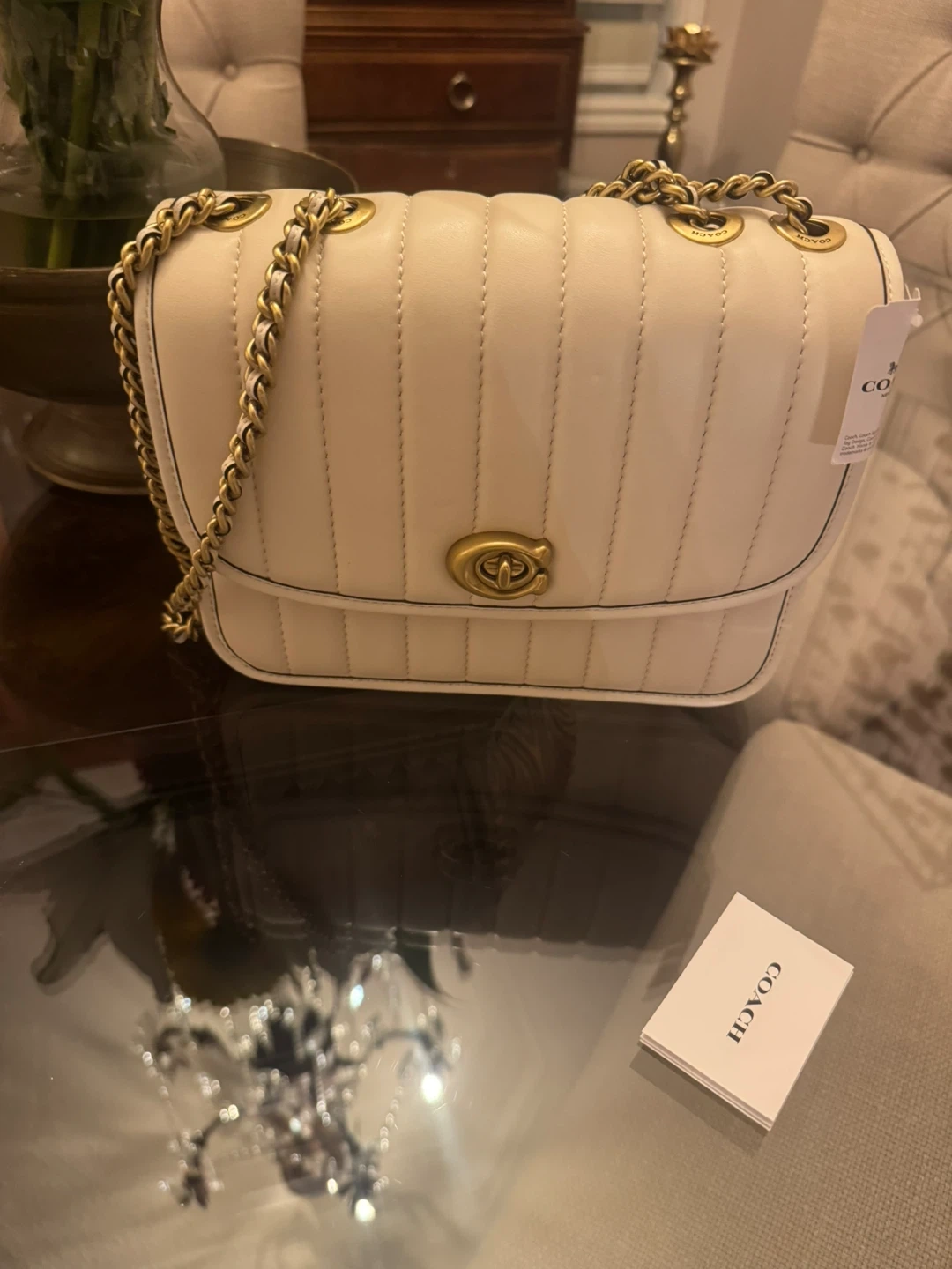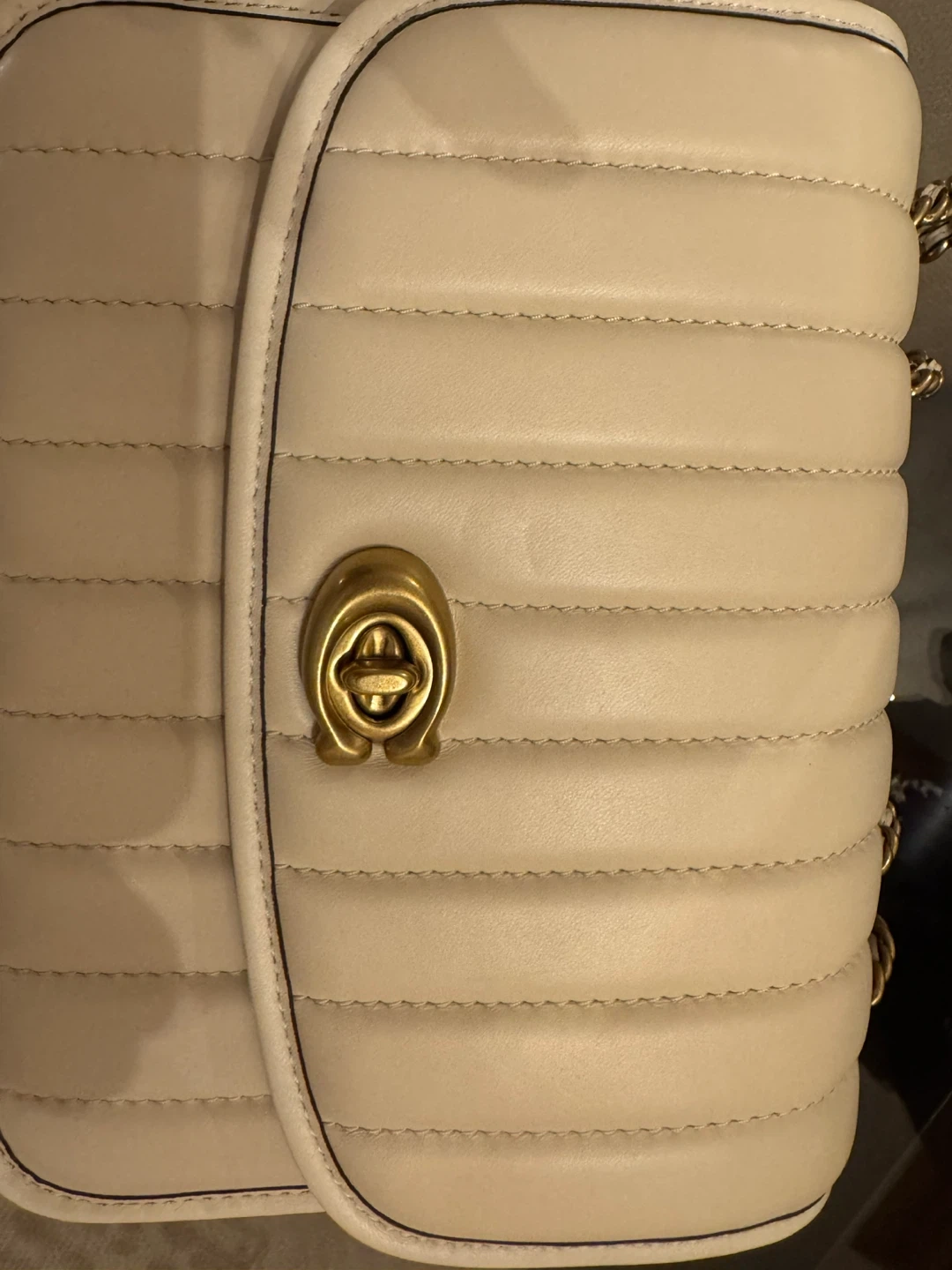 Stylish cream leather shoulder bag from Coach. It features a quilted design with a secure turn-lock closure and a versatile chain strap. This bag is perfect for carrying your essentials on the go.