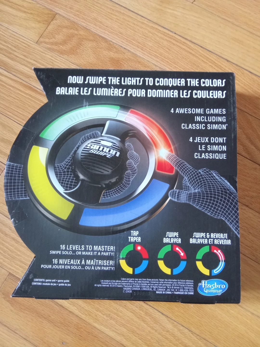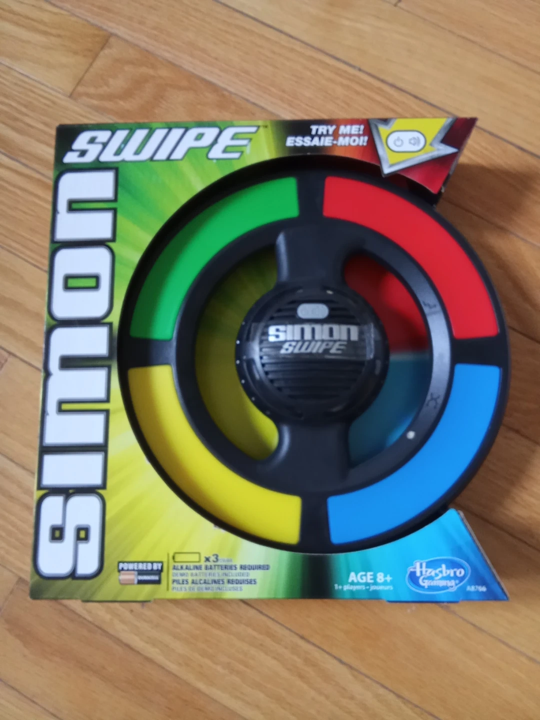 This is the Simon Swipe electronic game by Hasbro. It features multiple game modes including classic Simon. Recommended for ages 8 and up.