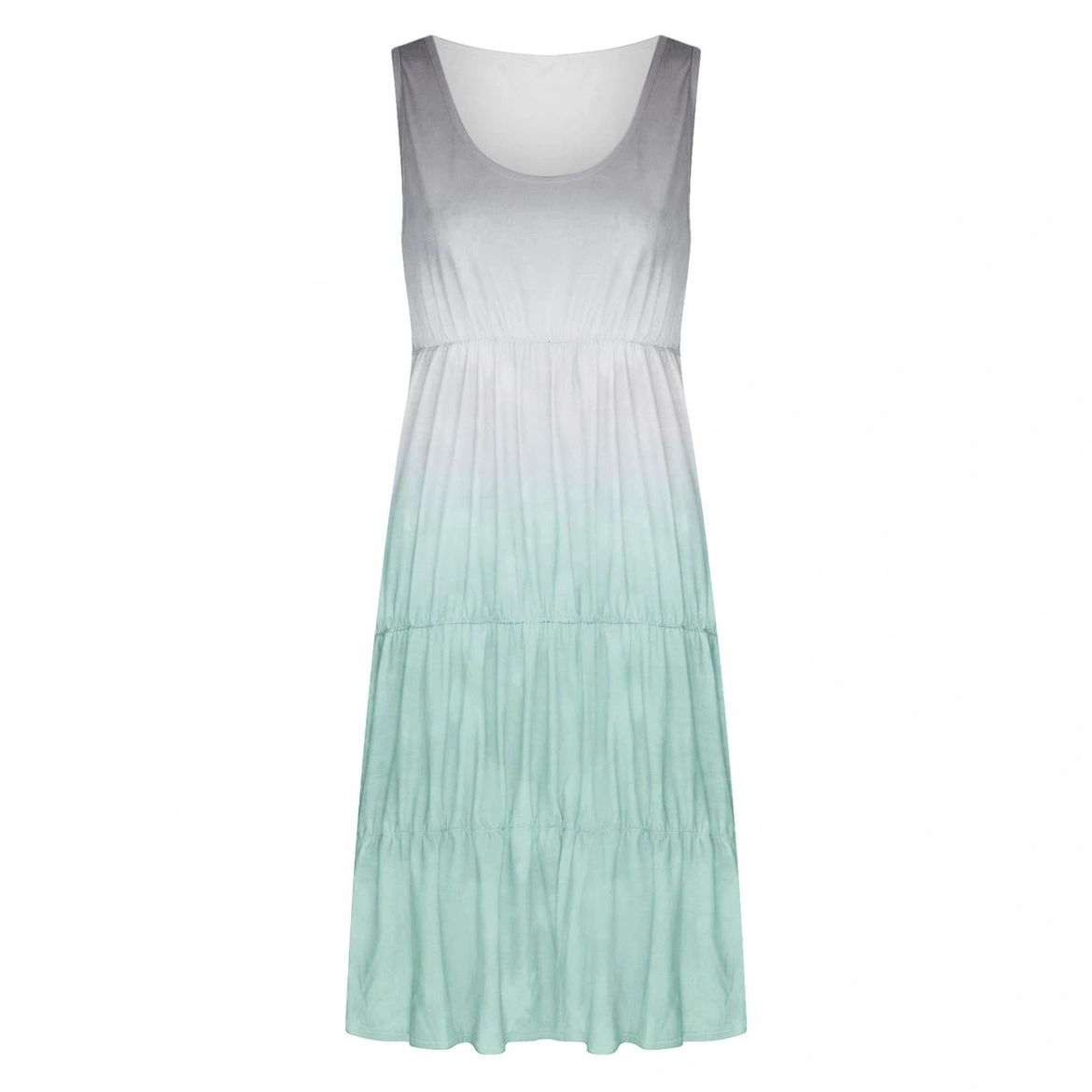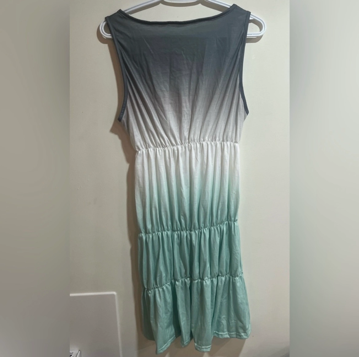 Sleeveless sundress with an ombre tie dye design in shades of grey and green. Features a scoop neck and tiered skirt. The dress is midi length and has pockets on the sides.
