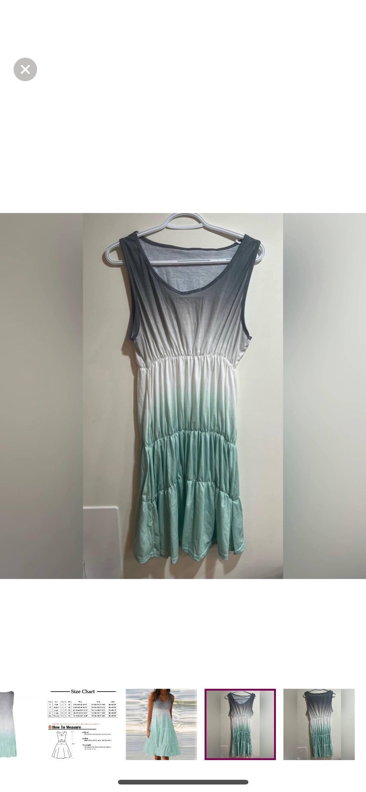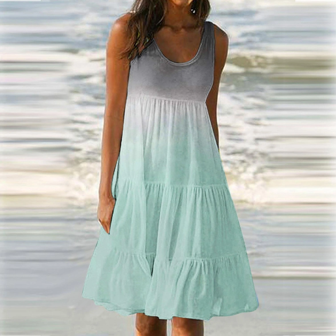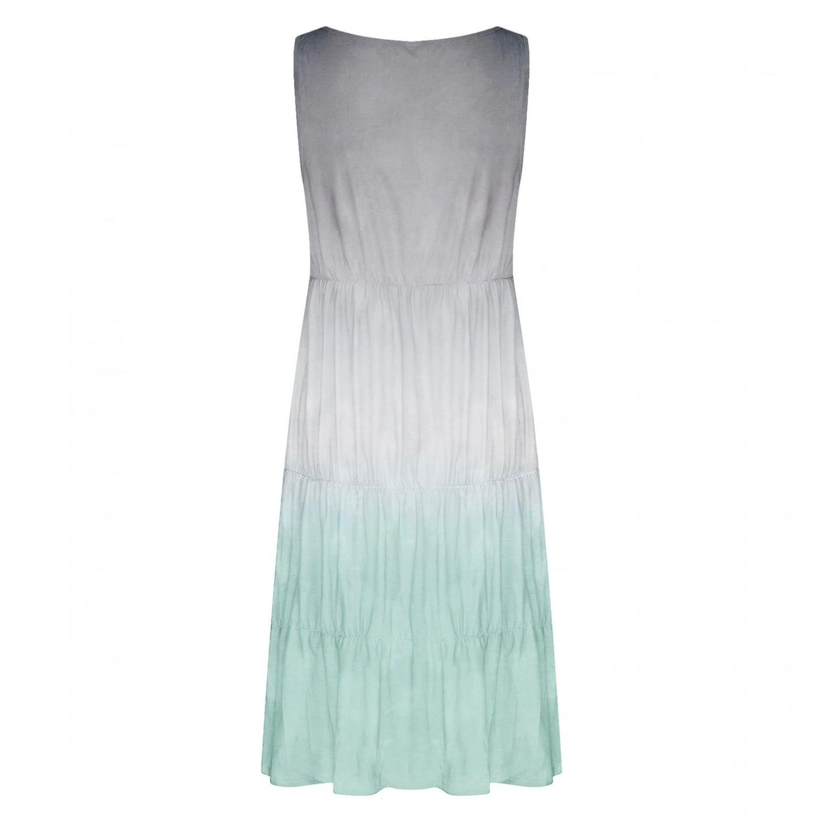 Sleeveless sundress with an ombre tie dye design in shades of grey and green. Features a scoop neck and tiered skirt. The dress is midi length and has pockets on the sides.