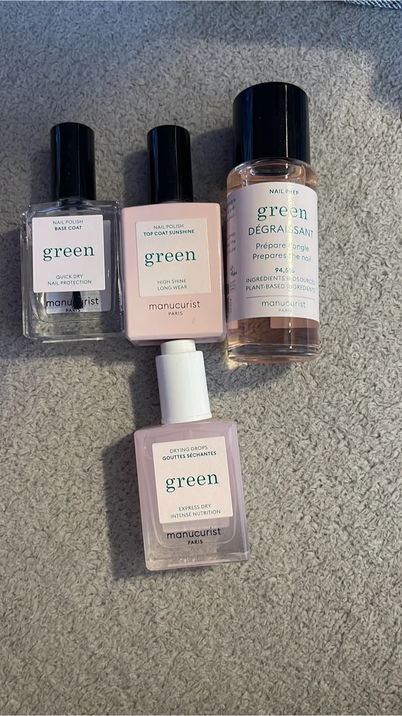 This Manucurist Green nail care set includes a base coat, top coat, nail prep, and drying drops. All products are plant-based and designed for quick dry and intense nutrition. Offers high shine and long wear.