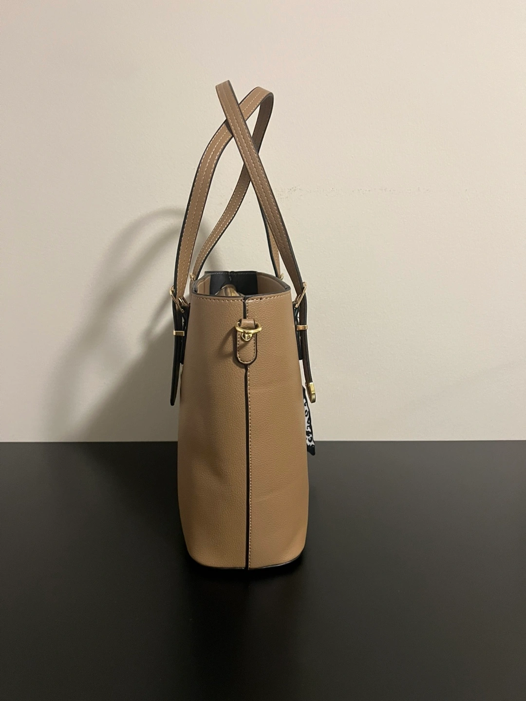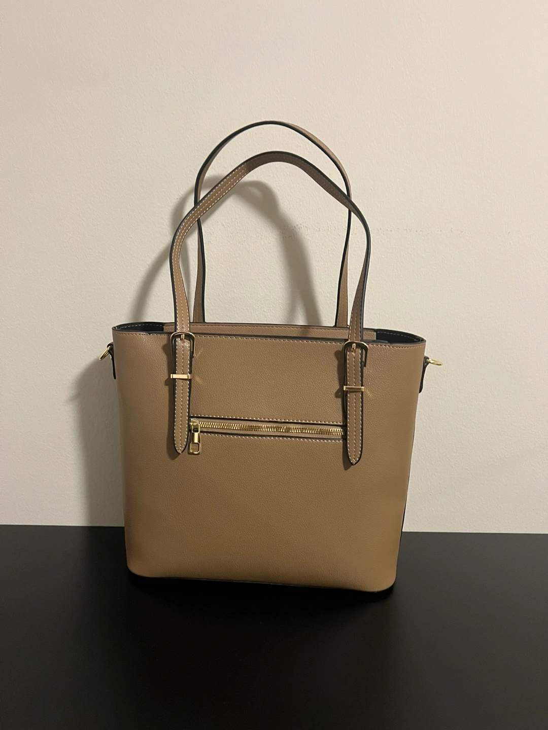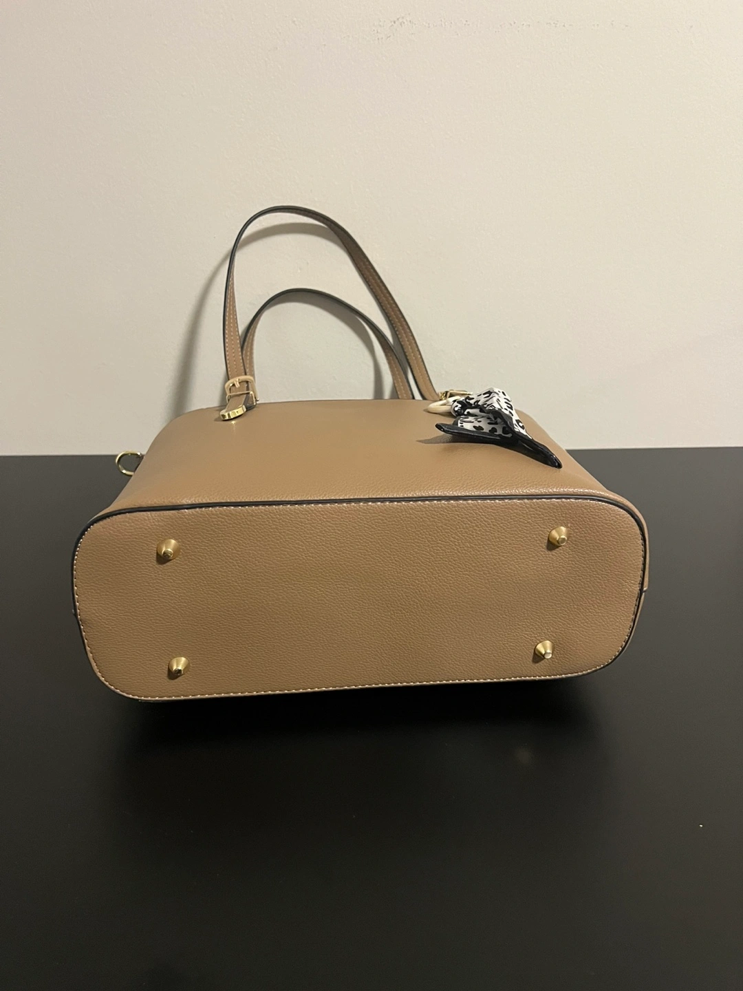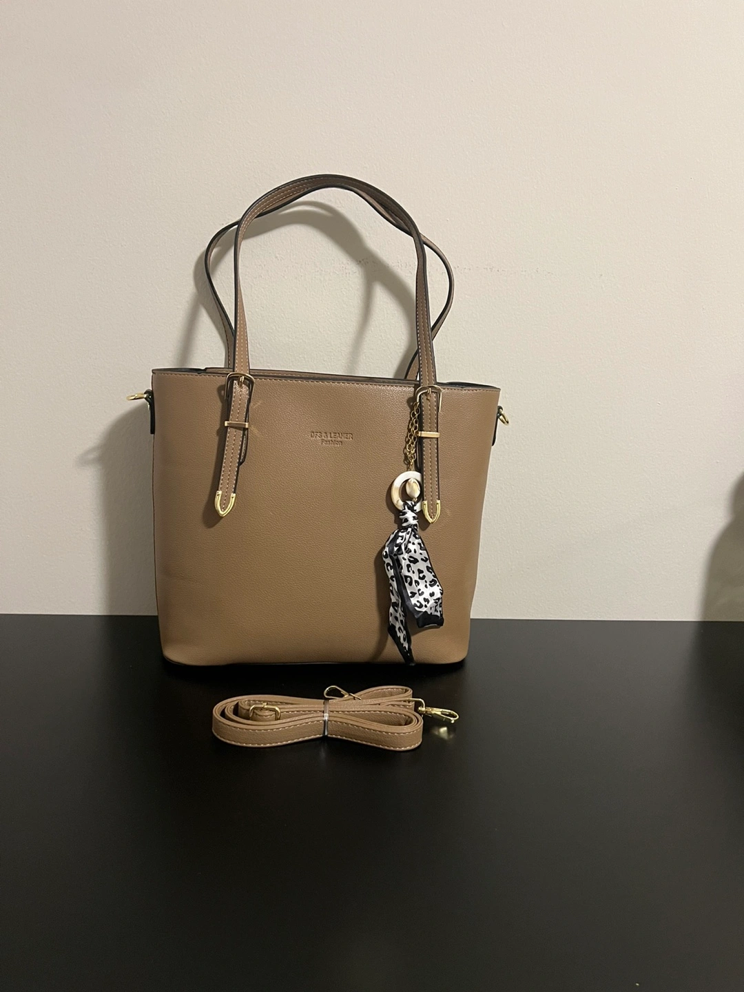 65This is a beautiful tote bag in a neutral beige colour. It's in great condition and ready for a new home. It also comes with an extra strap!