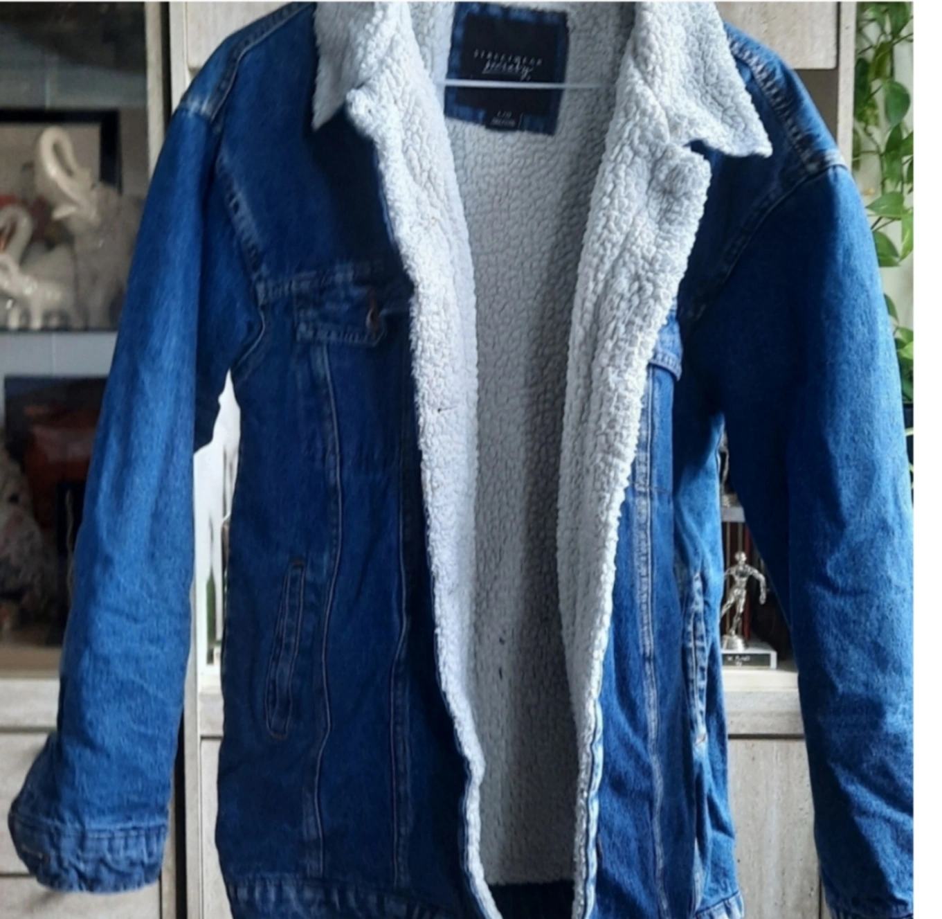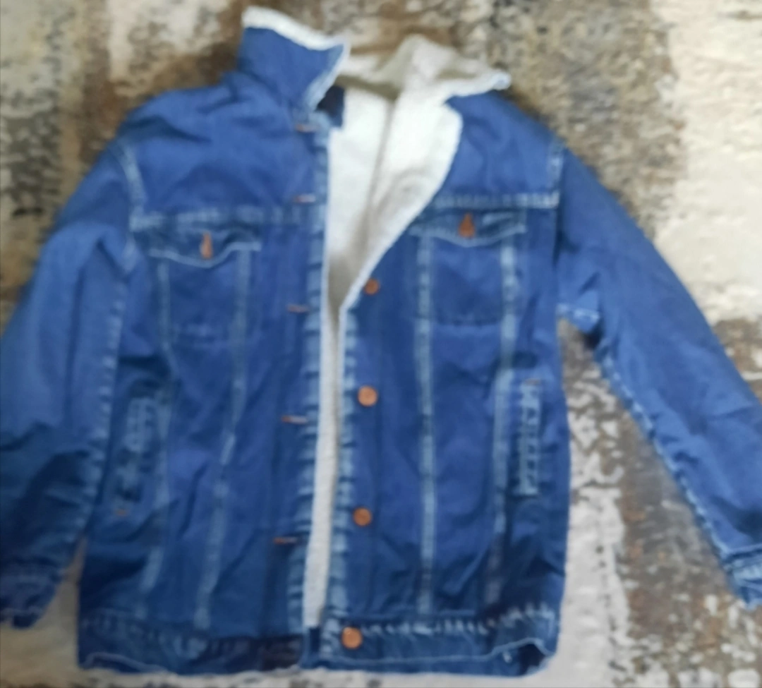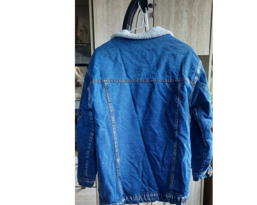 Blue denim jacket, sherpa lined. Classic style, warm and cozy. Great for fall and winter. Size Medium. Pet and Smoke free home