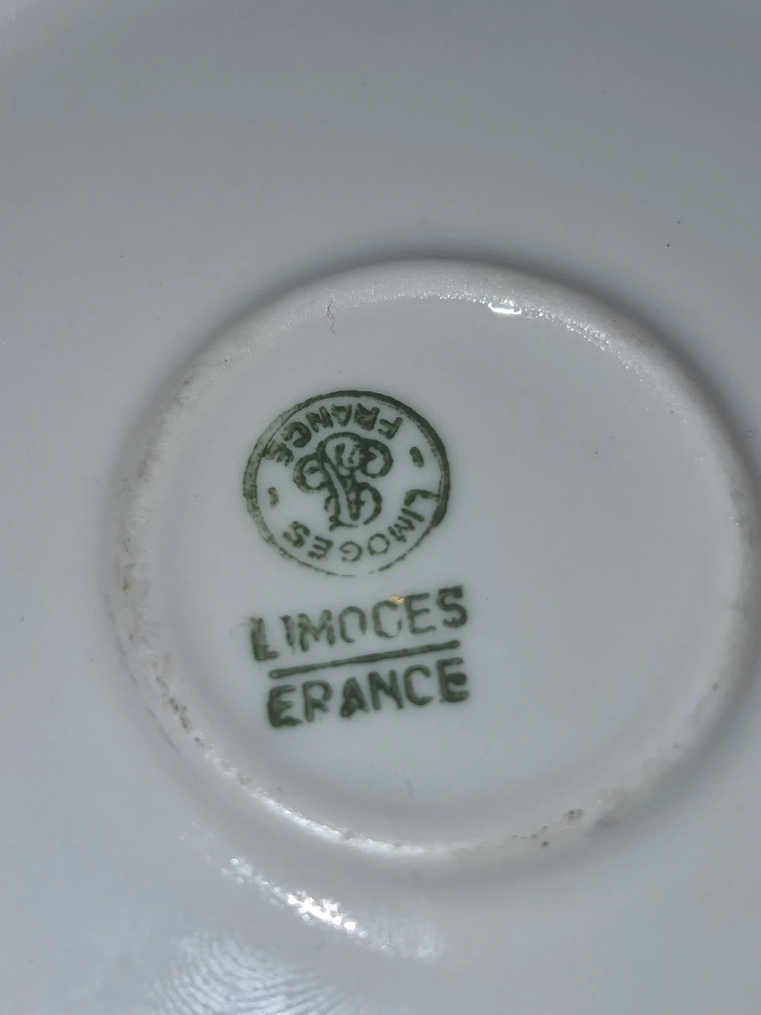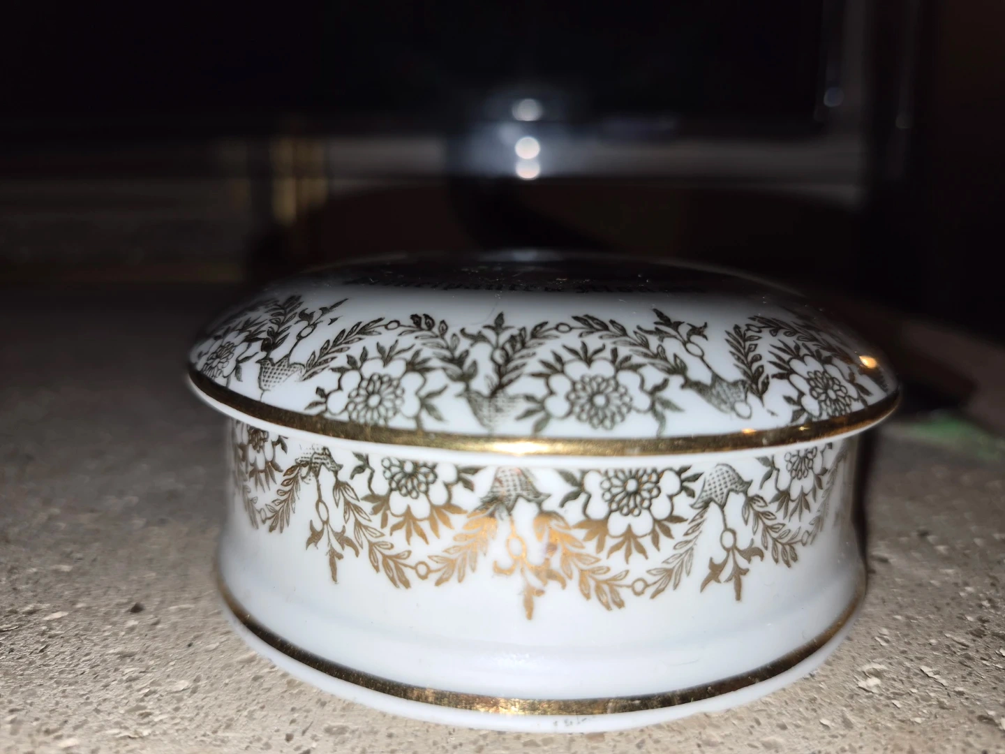 This is a Limoges porcelain trinket box featuring Prince Rainier III and Grace Kelly. It's decorated with a detailed gold floral pattern. Perfect for storing small treasures!