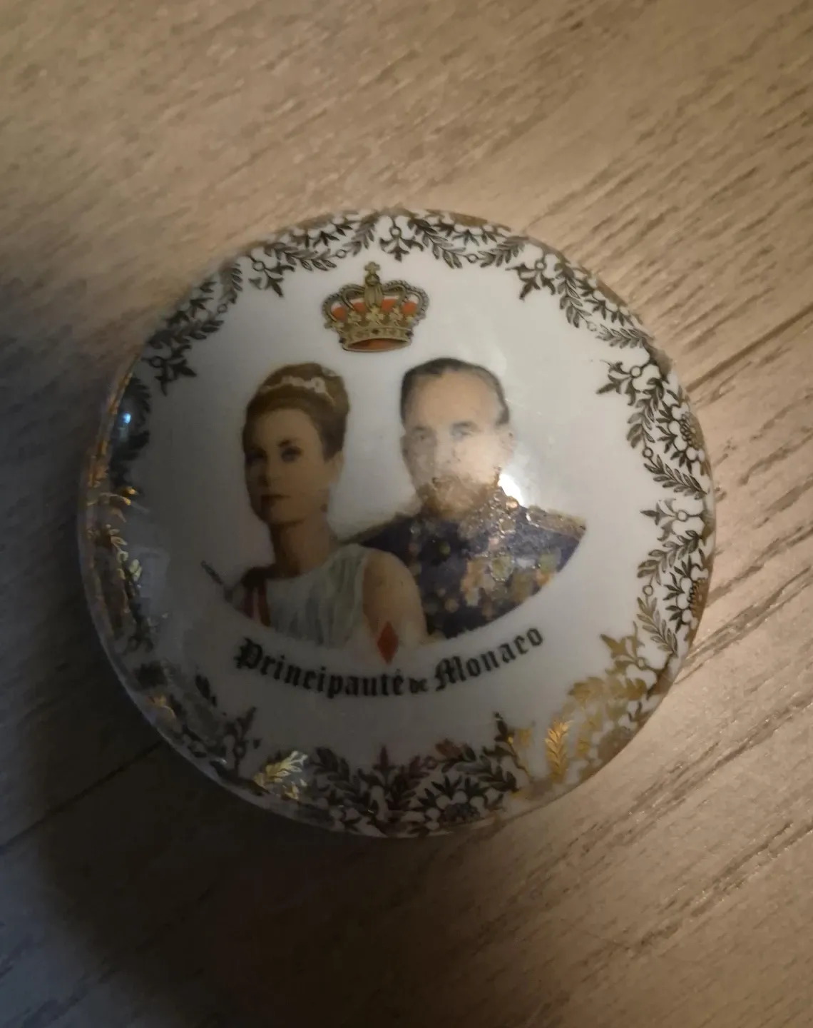 This is a Limoges porcelain trinket box featuring Prince Rainier III and Grace Kelly. It's decorated with a detailed gold floral pattern. Perfect for storing small treasures!
