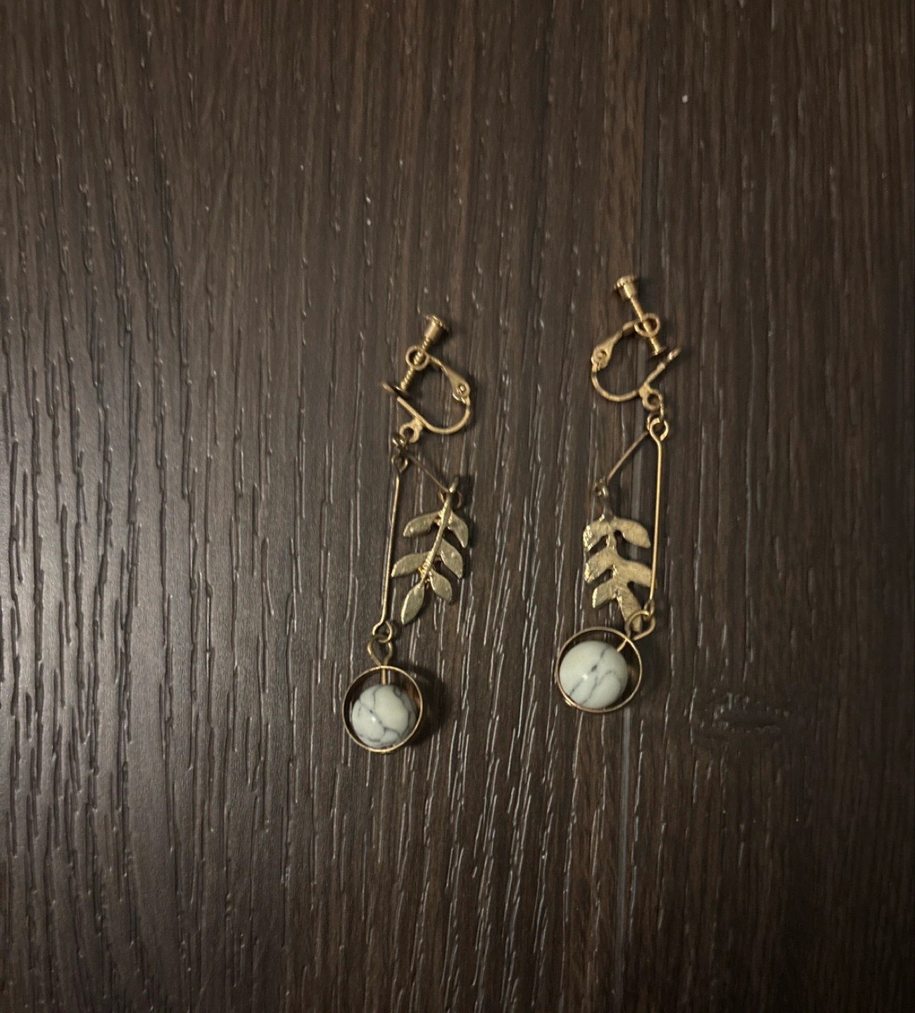These clip-on earrings feature a gold-tone finish with leaf charms and white stone drops. They're designed to clip on without piercing. Perfect for adding a touch of elegance to any outfit!
