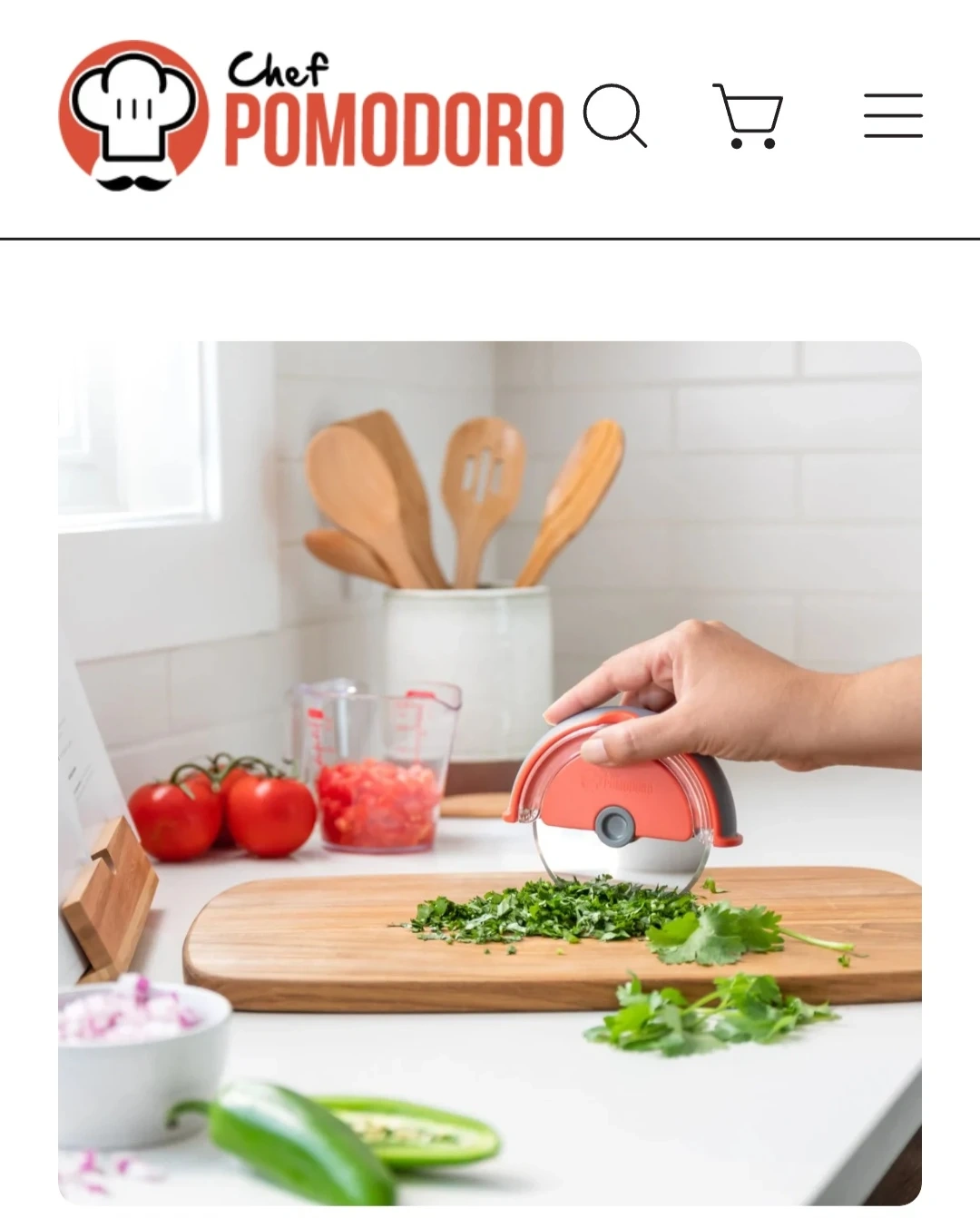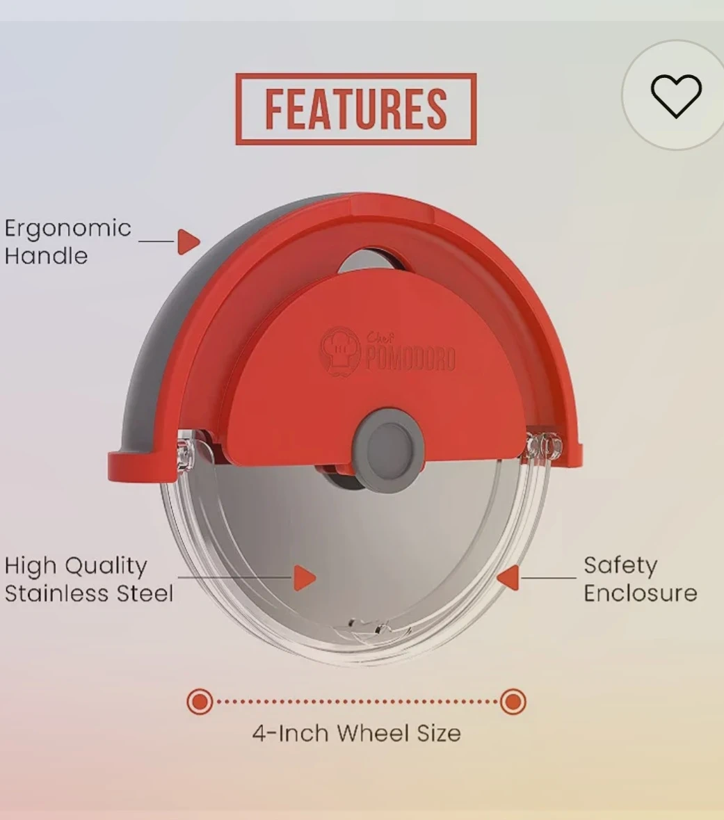 This Chef Pomodoro pizza cutter features a super sharp stainless steel blade and an ergonomic handle. It's great for slicing pizzas, but also chops and minces herbs and veggies. Includes a safety enclosure for worry-free use!