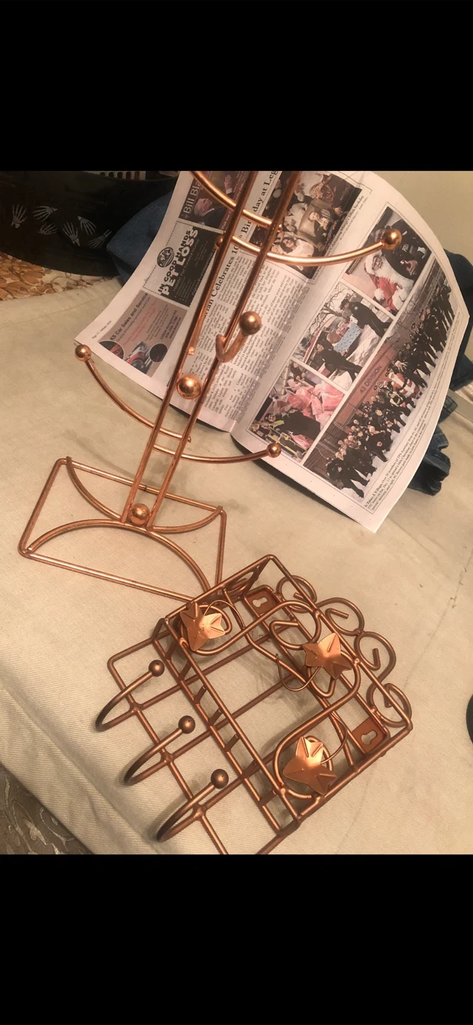 This set includes a copper-finished mug tree with hooks for mugs and a matching napkin holder. It's a nice way to organize your kitchen counter or dining table.