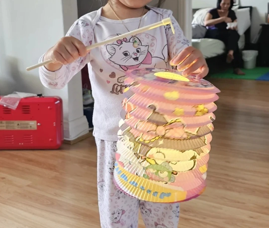 A fun paper lantern featuring a cute character design, perfect for kids. It's made of paper and comes with a wooden handle for easy carrying. Great for parties or room decor! Small battery operated light inside thag turns on and off