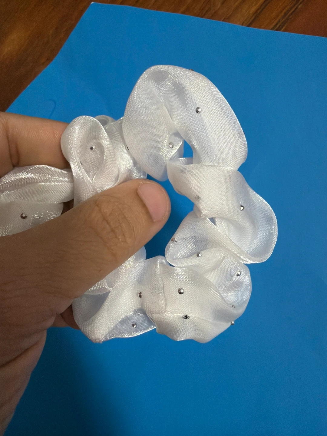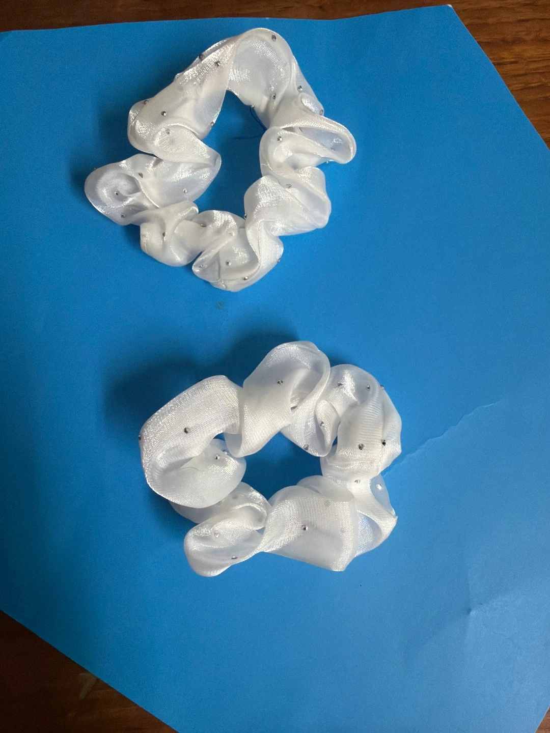 Two shimmery white scrunchies adorned with small rhinestones. These fabric hair ties offer a bit of sparkle and hold hair securely. They're great for adding a touch of glam to everyday hairstyles or for dressing up an outfit!