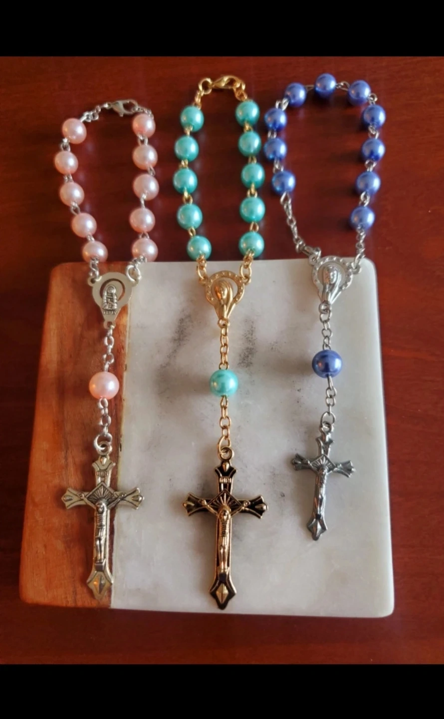Three pretty beaded rosaries, each featuring a cross and crucifix charm. They come in pink, teal, and blue pearlized beads. Custom made new.