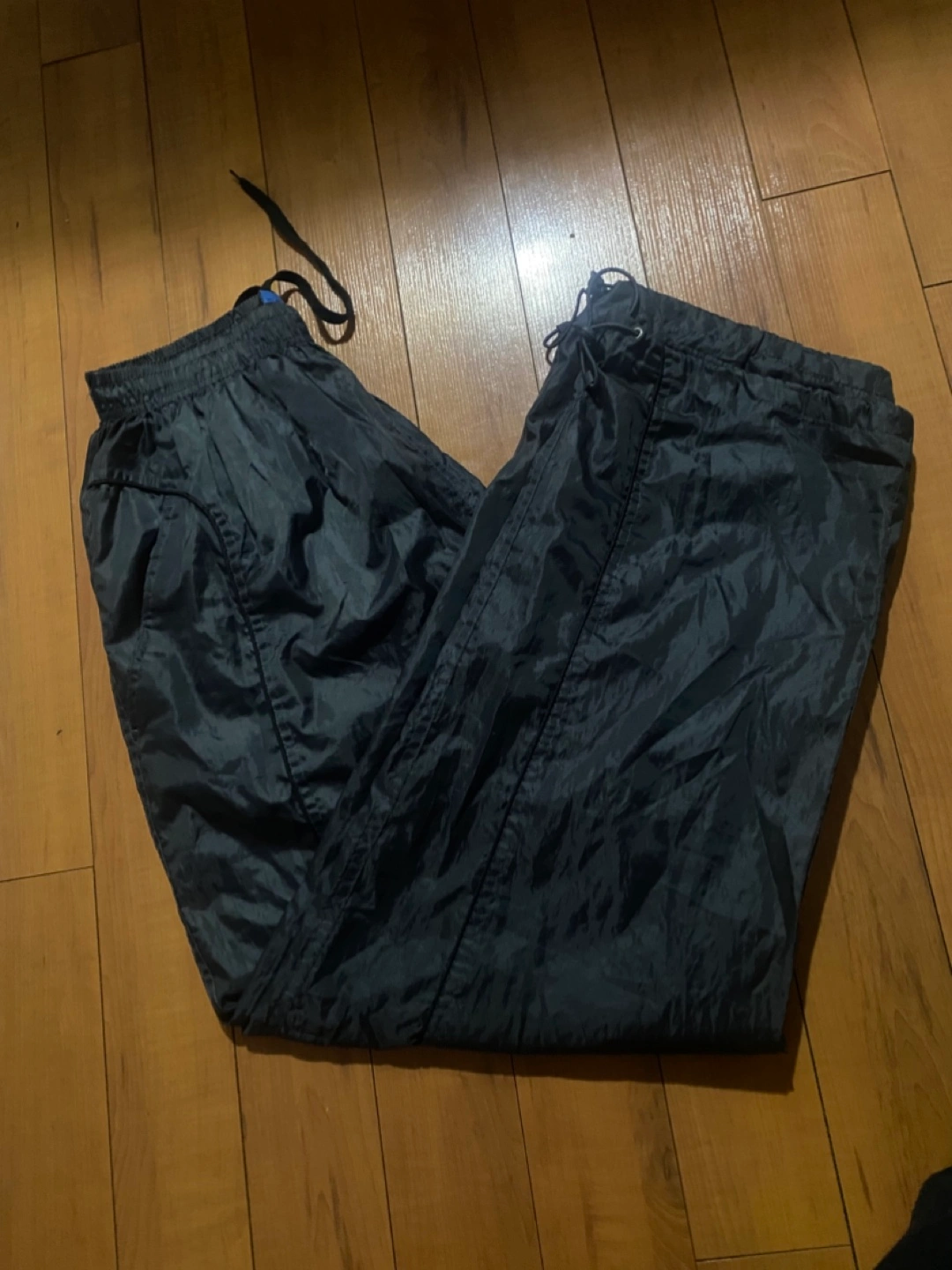 Dark grey track pants. Size large. 100% polyester. Machine wash warm separately. Do not bleach. Tumble dry low. Do not iron. Made in China.