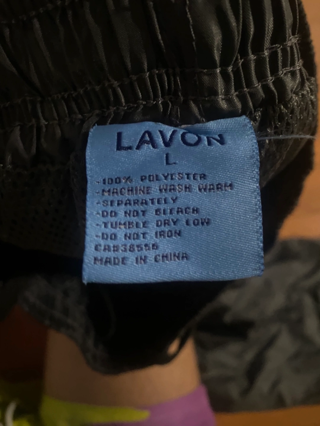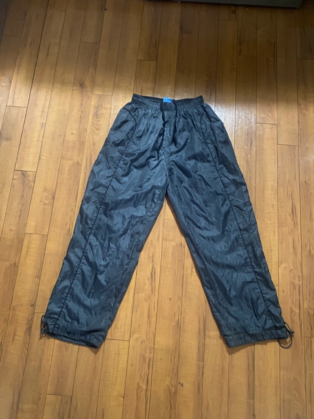 Dark grey track pants. Size large. 100% polyester. Machine wash warm separately. Do not bleach. Tumble dry low. Do not iron. Made in China.