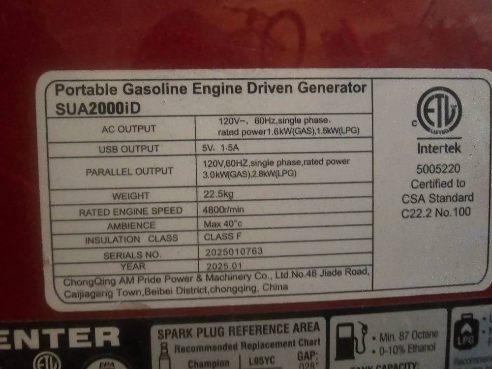 25Selling a SUA2000iD portable gasoline engine driven generator. It has: - AC Output: 120V, 60Hz, single phase, rated power 1.6kW(GAS), 1.5kW(LPG) - USB Output: 5V, 1.5A - Parallel Output: 120V, 60Hz, single phase, rated power 3.0kW(GAS), 2.8kW(LPG) - Weight: 22.5kg - Rated Engine Speed: 4800r/min - Ambience: Max 40°c - Insulation Class: Class F - Year: 2025 January used once