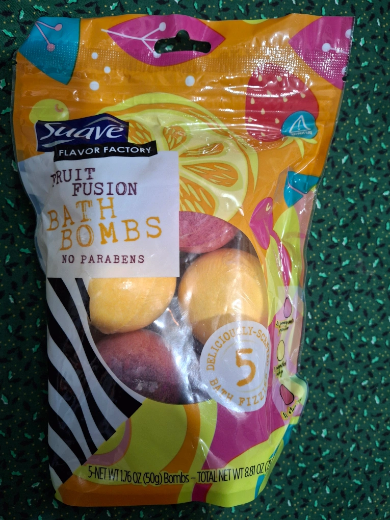 I'm selling a pack of Suave Flavor Factory Fruit Fusion Bath Bombs! This pack includes 5 bath bombs with delicious scents. You'll find 1 Strawberry Serenade, 2 Magnificent Mango, and 2 Pom Pom White Passion bath fizzies. These bath bombs are paraben-free, so you can relax and enjoy your bath time