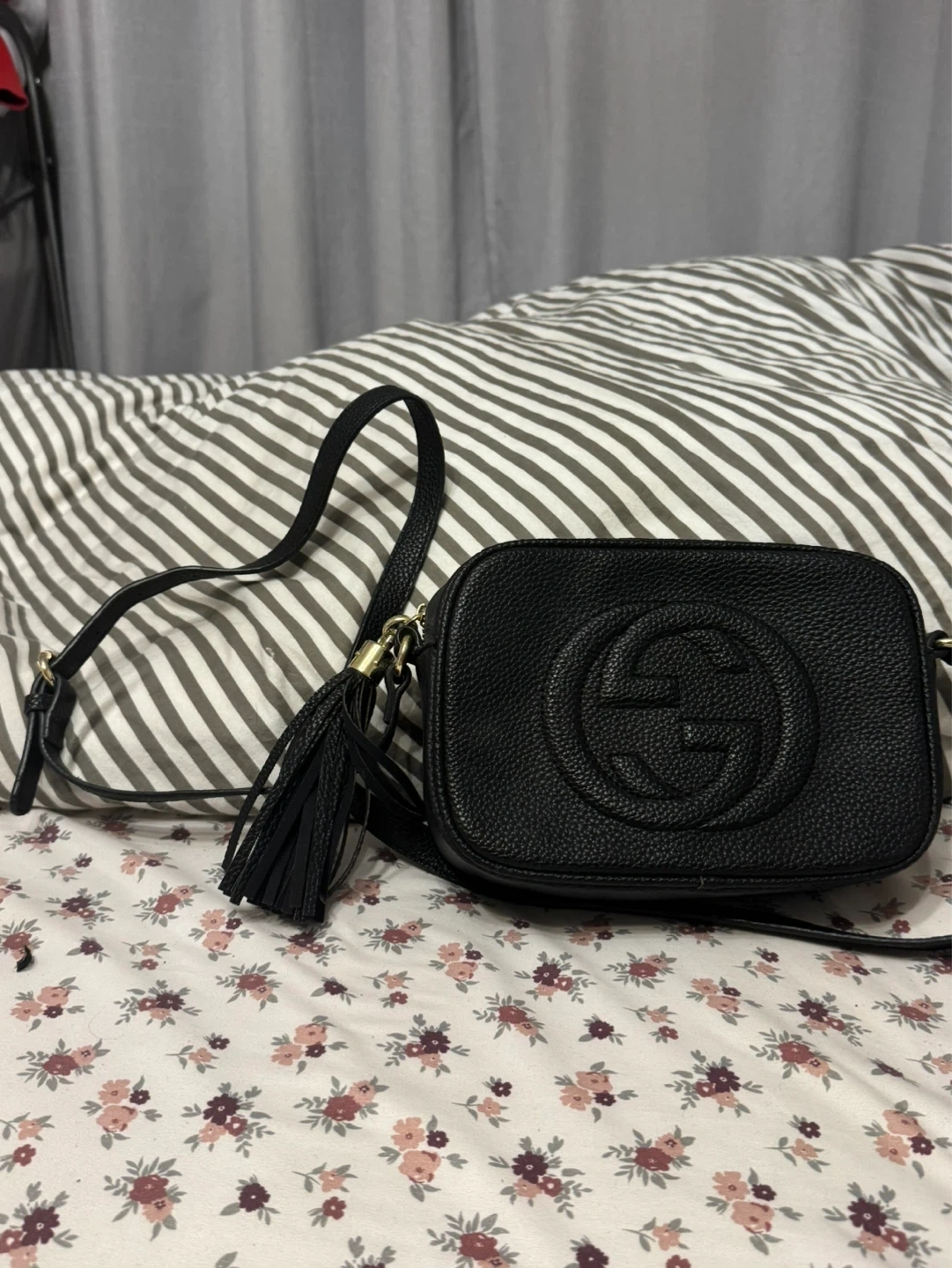 This is a black pebbled leather Gucci camera bag. It features the iconic interlocking G logo embossed on the front and a tassel detail on the zipper. Leather interior.