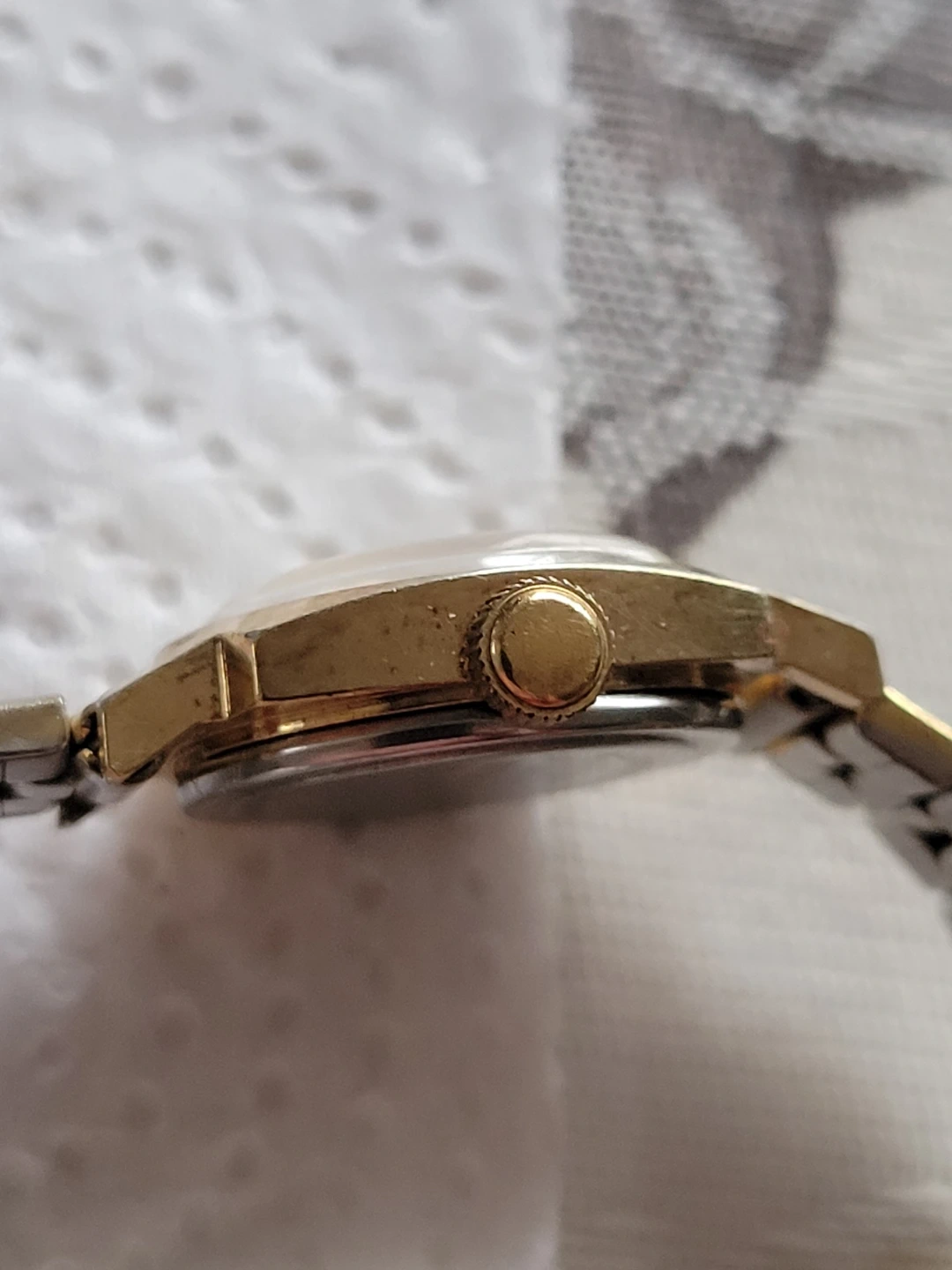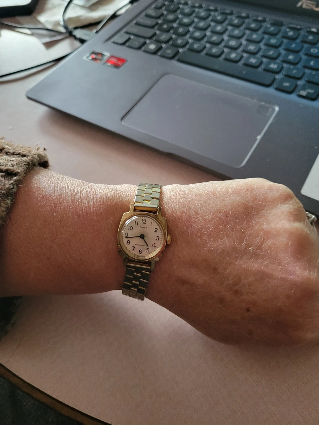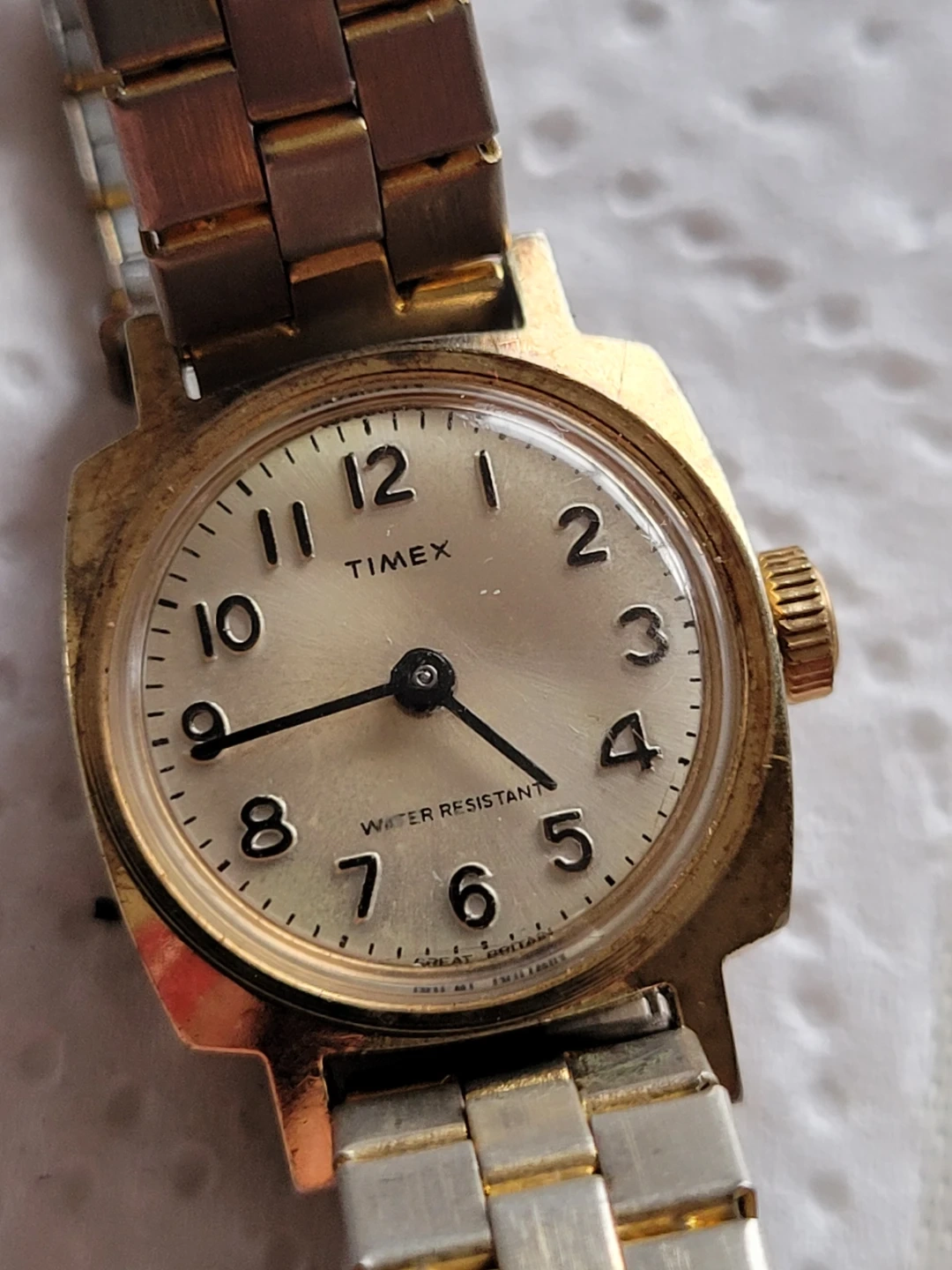 1979 Timex women's watch with a gold-tone metal band. Band shows wear. It's water resistant and features an analog dial. The manual wound movement is running well. This vintage timepiece has a touch of timeless charm.The watch features a comfortable stretch metal bracelet that fits seamlessly into any wrist size, making it a versatile accessory for any occasion. Designed in England during the late 1970s, this wristwatch is a testament to the style and craftsmanship of the era.