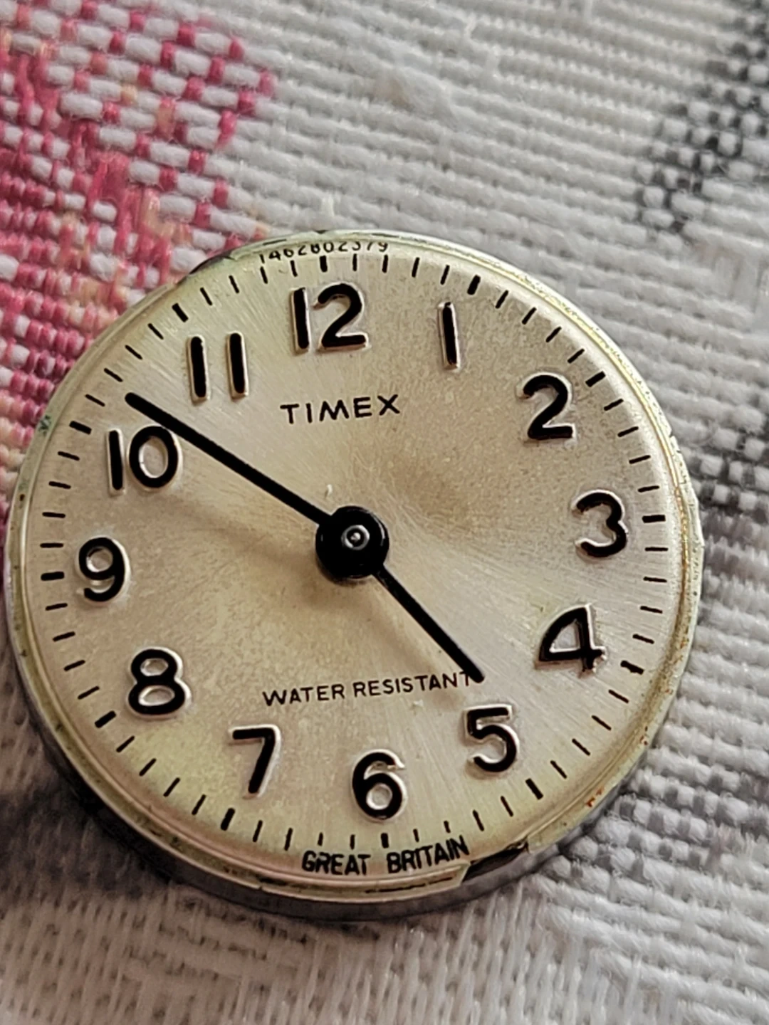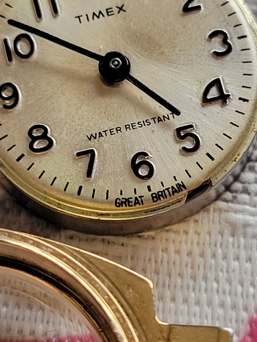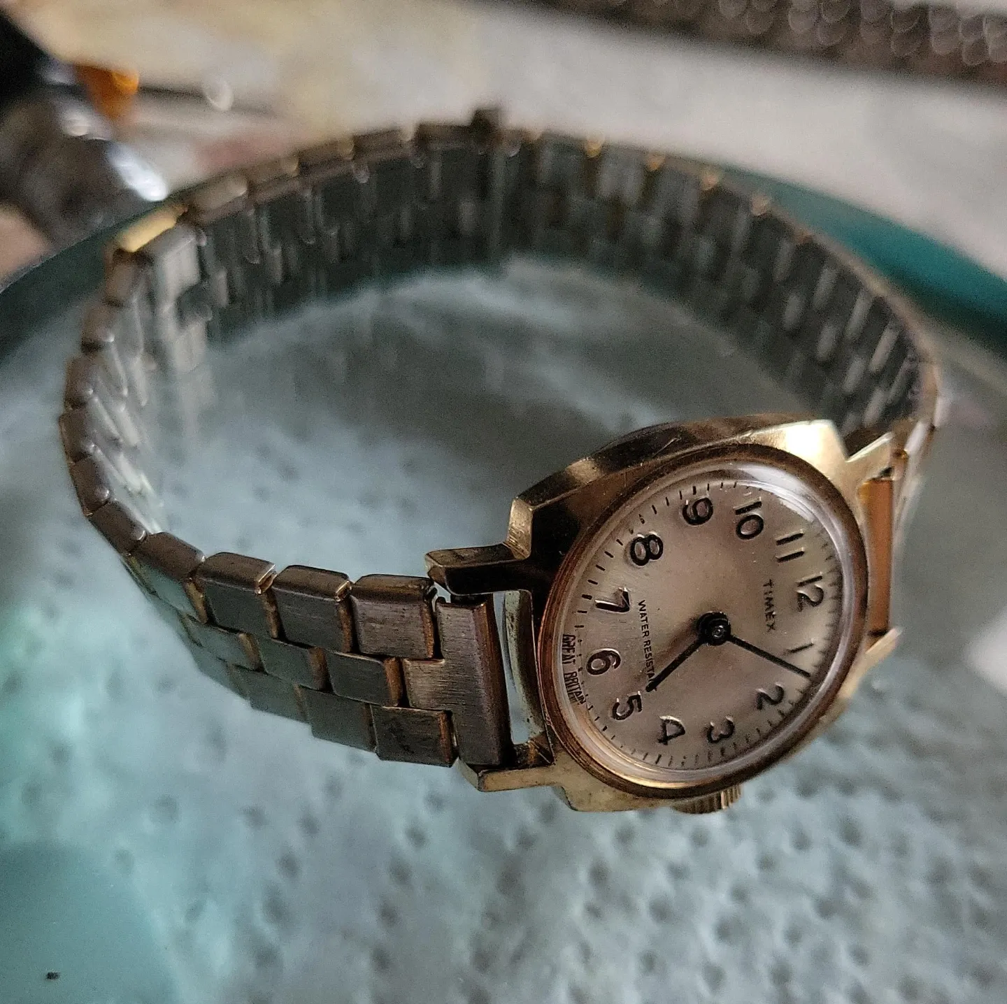 1979 Timex women's watch with a gold-tone metal band. Band shows wear. It's water resistant and features an analog dial. The manual wound movement is running well. This vintage timepiece has a touch of timeless charm.The watch features a comfortable stretch metal bracelet that fits seamlessly into any wrist size, making it a versatile accessory for any occasion. Designed in England during the late 1970s, this wristwatch is a testament to the style and craftsmanship of the era.