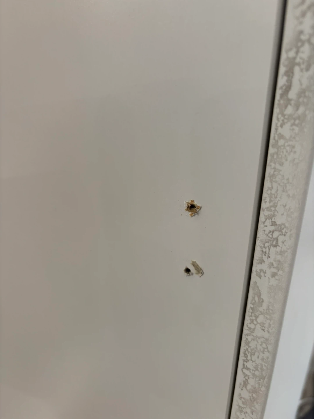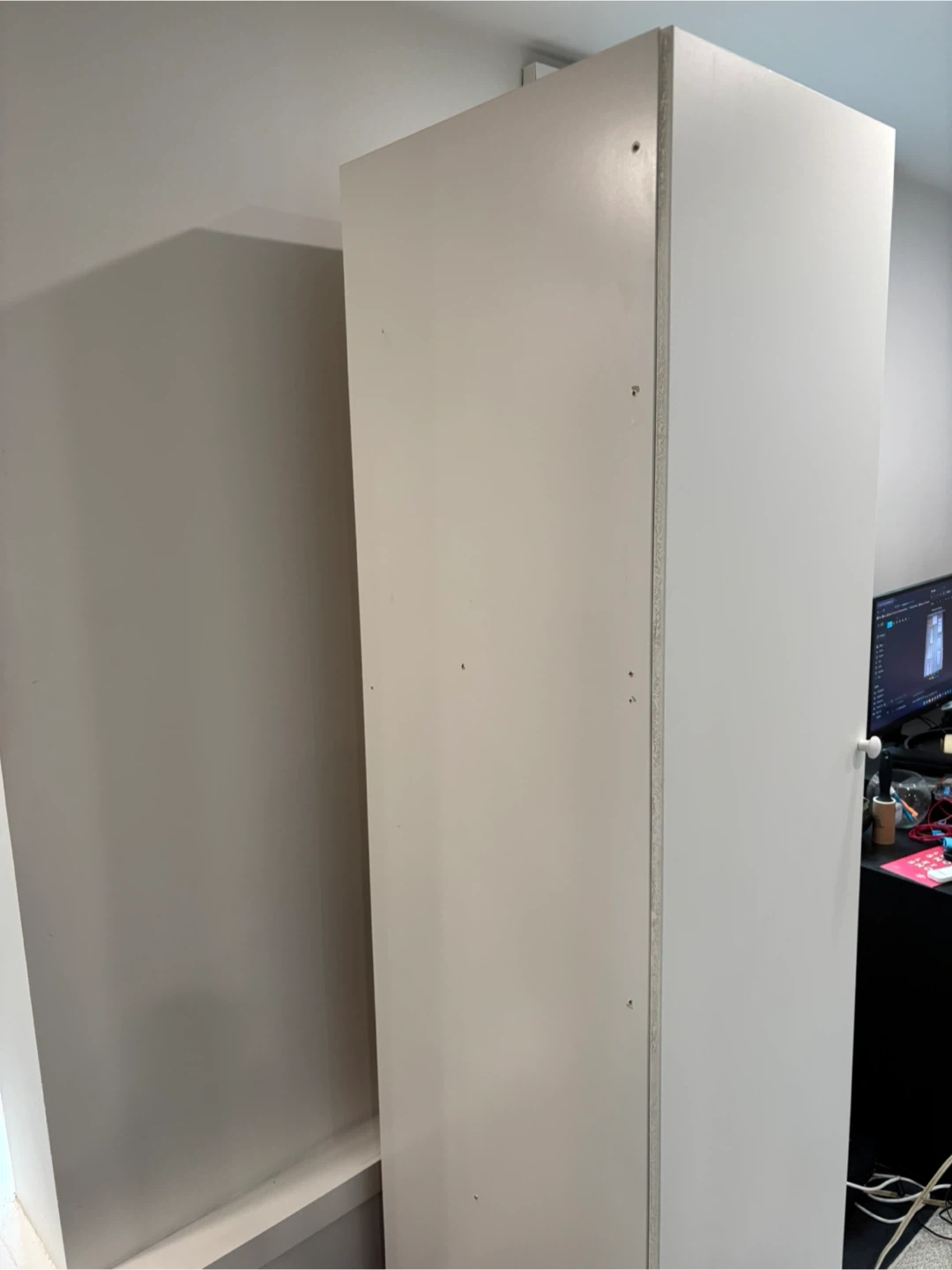 This is a tall, white storage cabinet with multiple shelves. It's perfect for organizing various items in your home or office. Sturdy and in good condition however as seen from the specific images, there are screw holes on one of the sides as it was mounted to a wall. Other than that, great condition. Includes 4 internal shelves which are all height adjustable.
