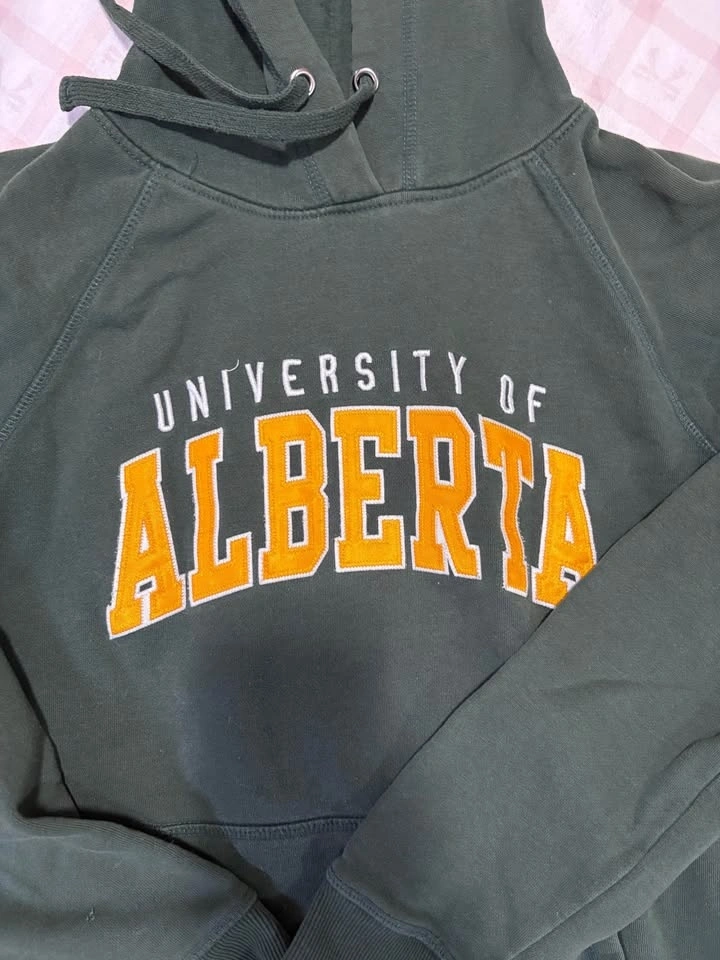 Green Hoodie University of Alberta - $20. Size Medium, fits more like a Small/ Extra Small. No stains or fraying.