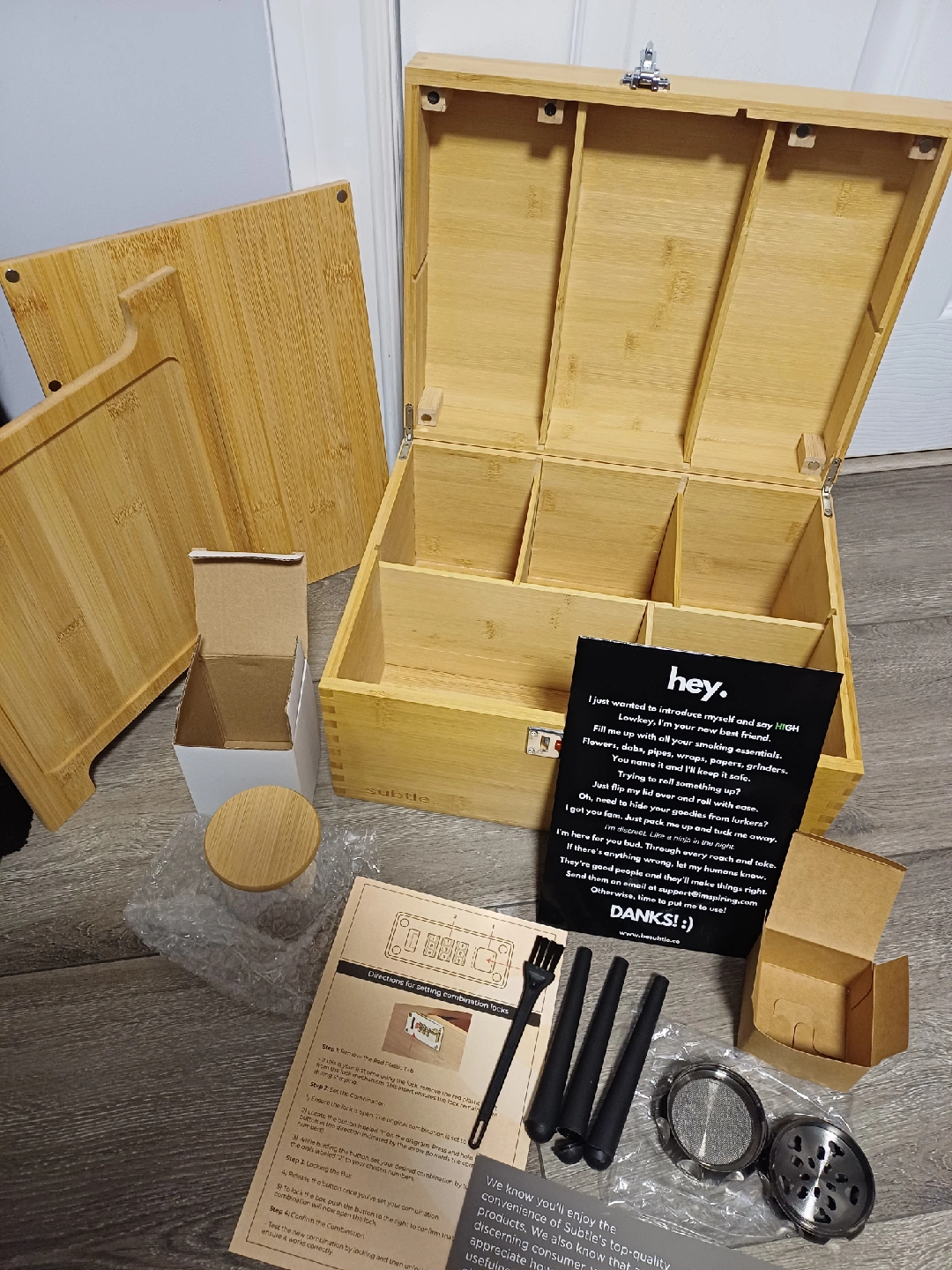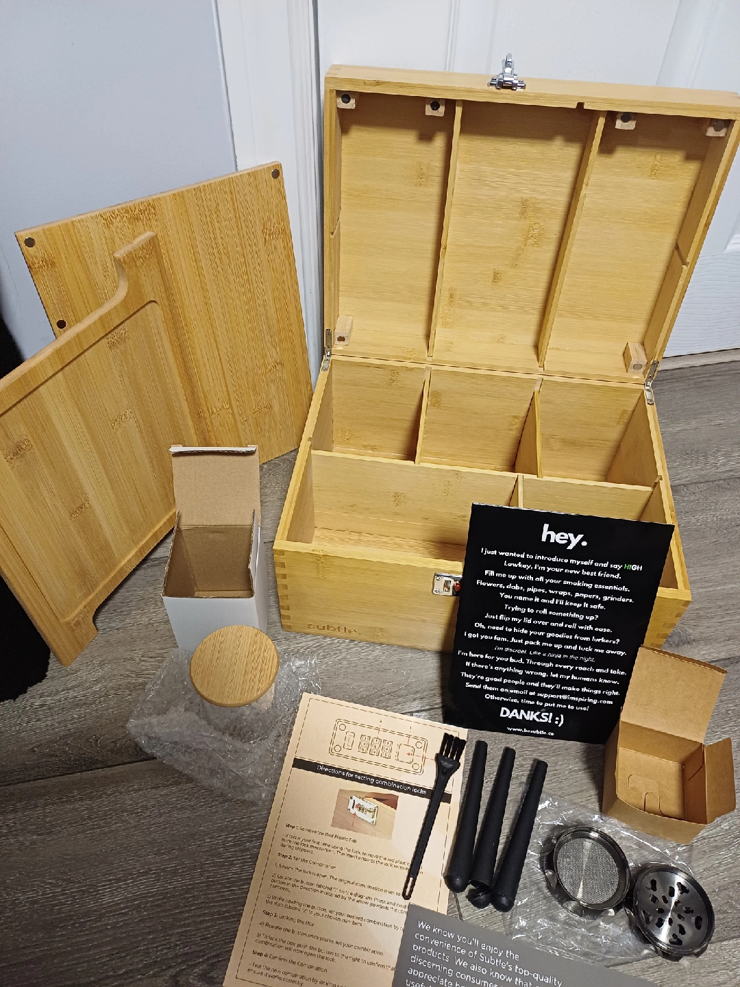 107Selling a Subtle stash box made of bamboo. It comes with all the accessories shown in the photos, including a tray, divider management space and other helpful tools for keeping your supplies organized. This box is perfect for anyone looking to keep their items neatly stored away. Perfect also for your smoking essentials flowers, dabs, pipes, wraps, papers, grinders name it. With lock for your safety valuables and for other storage items. In Brand new condition.