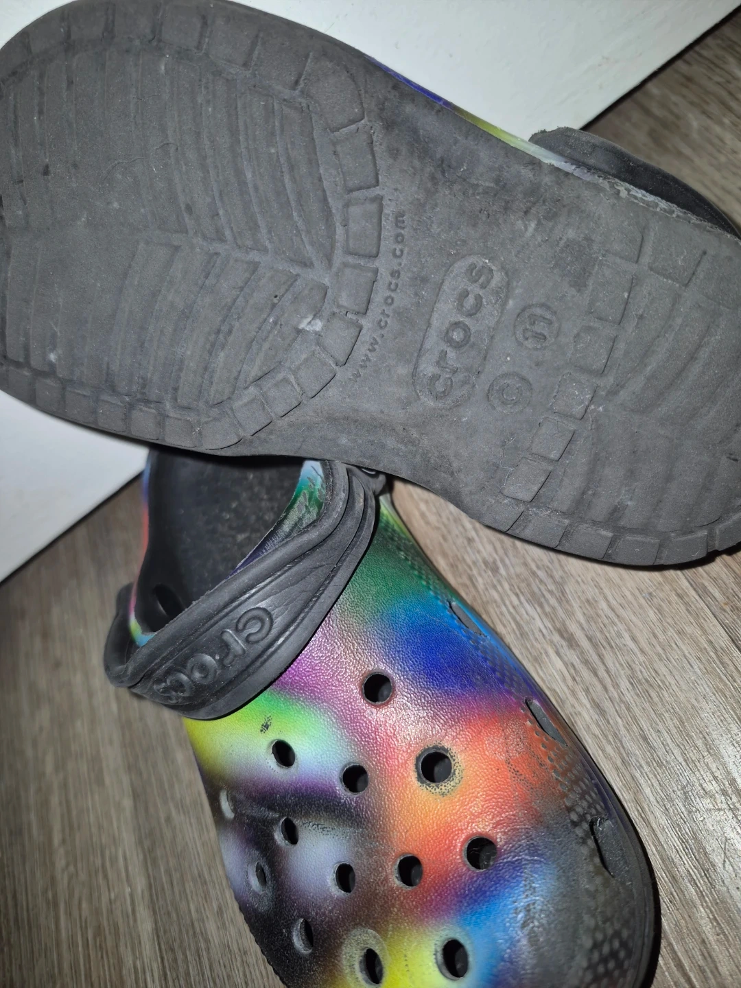 These Crocs are a size 11 and feature a fun rainbow spray paint design. They're made of Croslite material for comfort. Perfect for casual wear!