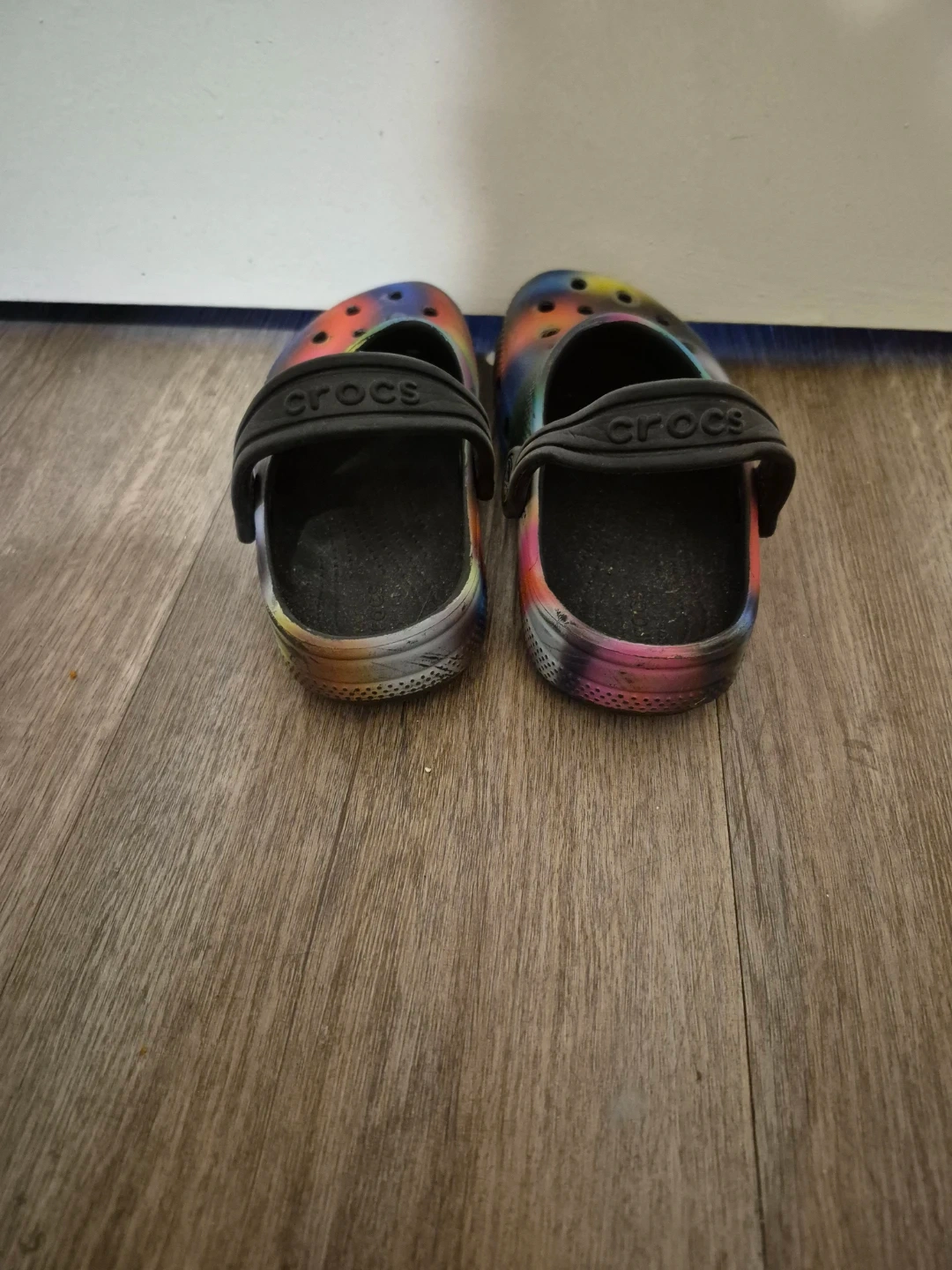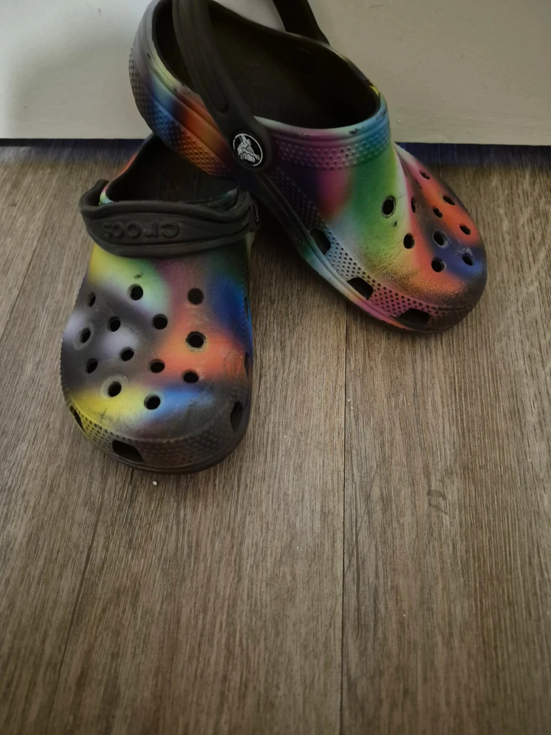 These Crocs are a size 11 and feature a fun rainbow spray paint design. They're made of Croslite material for comfort. Perfect for casual wear!