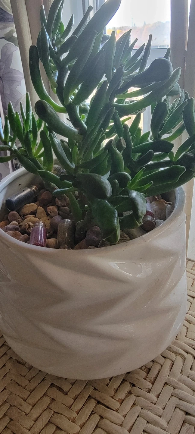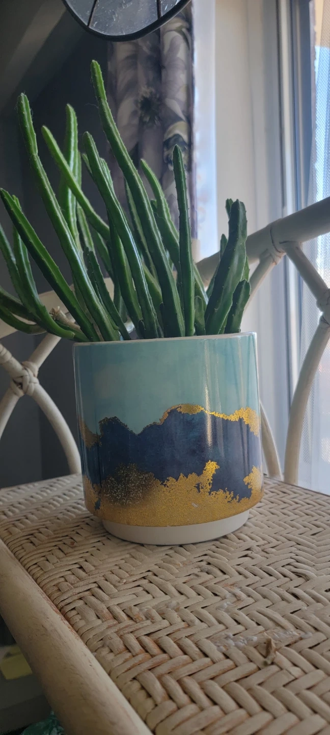 57A healthy succulent plant potted in a decorative pot. The first pot is white with a textured design and the second is blue and gold. Would look great in any home!