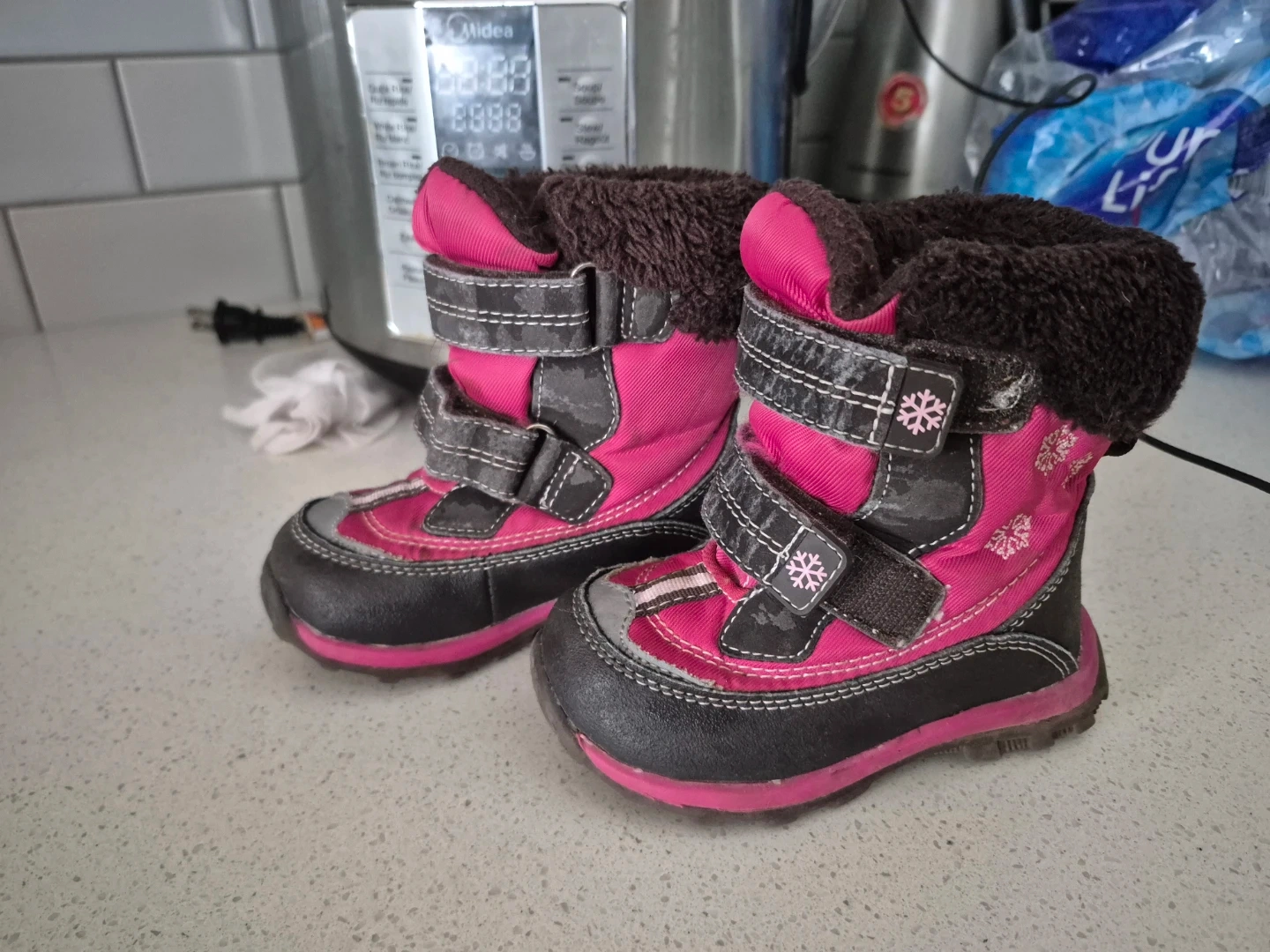 These pink winter boots are perfect for keeping little feet warm and dry during the snowy months! They feature a fuzzy lining and velcro straps for easy on and off. They show some signs of wear, but still have lots of life left in them!